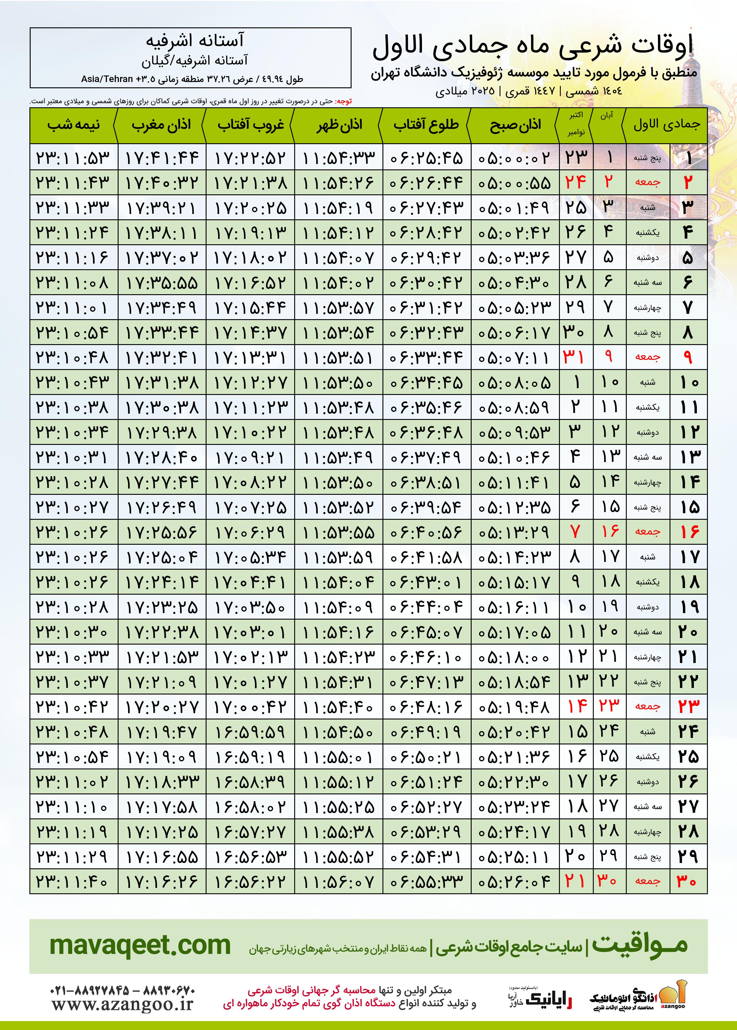 جدول اوقات شرعی جمادی الاول ١٤٤٧ قمری شهر آستانه اشرفیه
