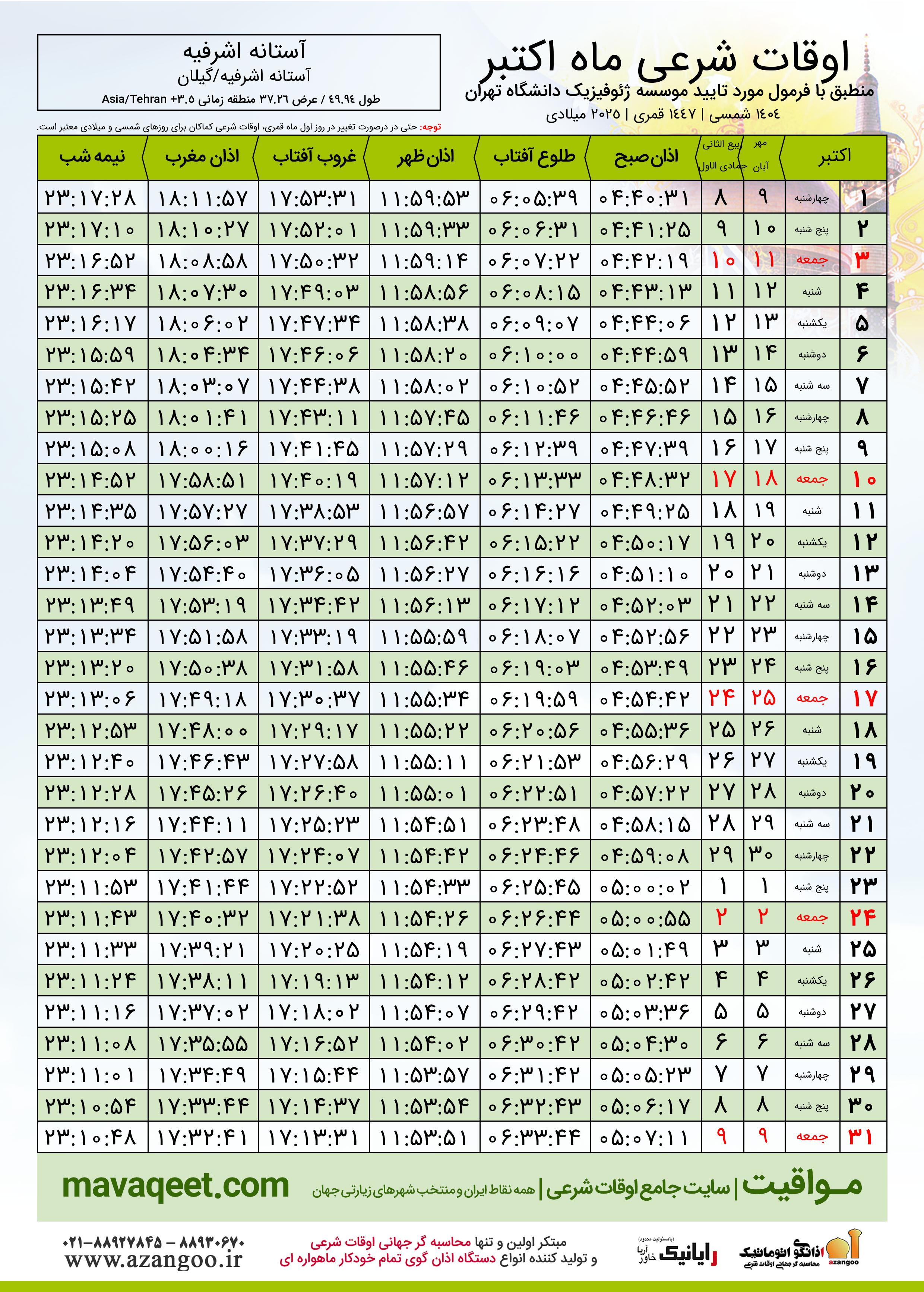 اوقات شرعی اکتبر ٢٠٢٥ میلادی شهر آستانه اشرفیه