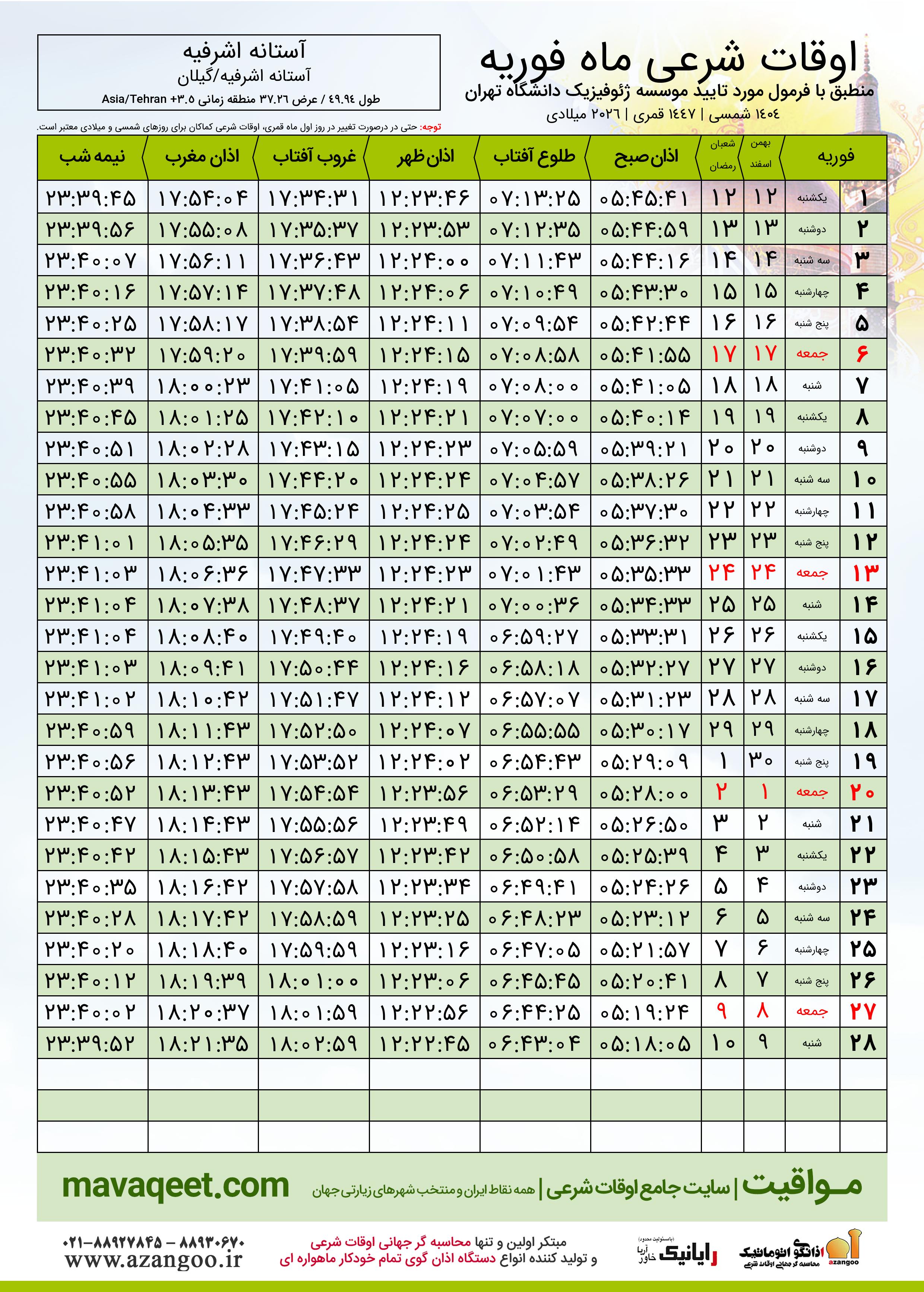 دانلود اوقات شرعی ماه رمضان ٠٤ - ١٤٠٤ شمسی | ٢٠٢٦ میلادی | ١٤٤٧ قمری شهر آستانه اشرفیه