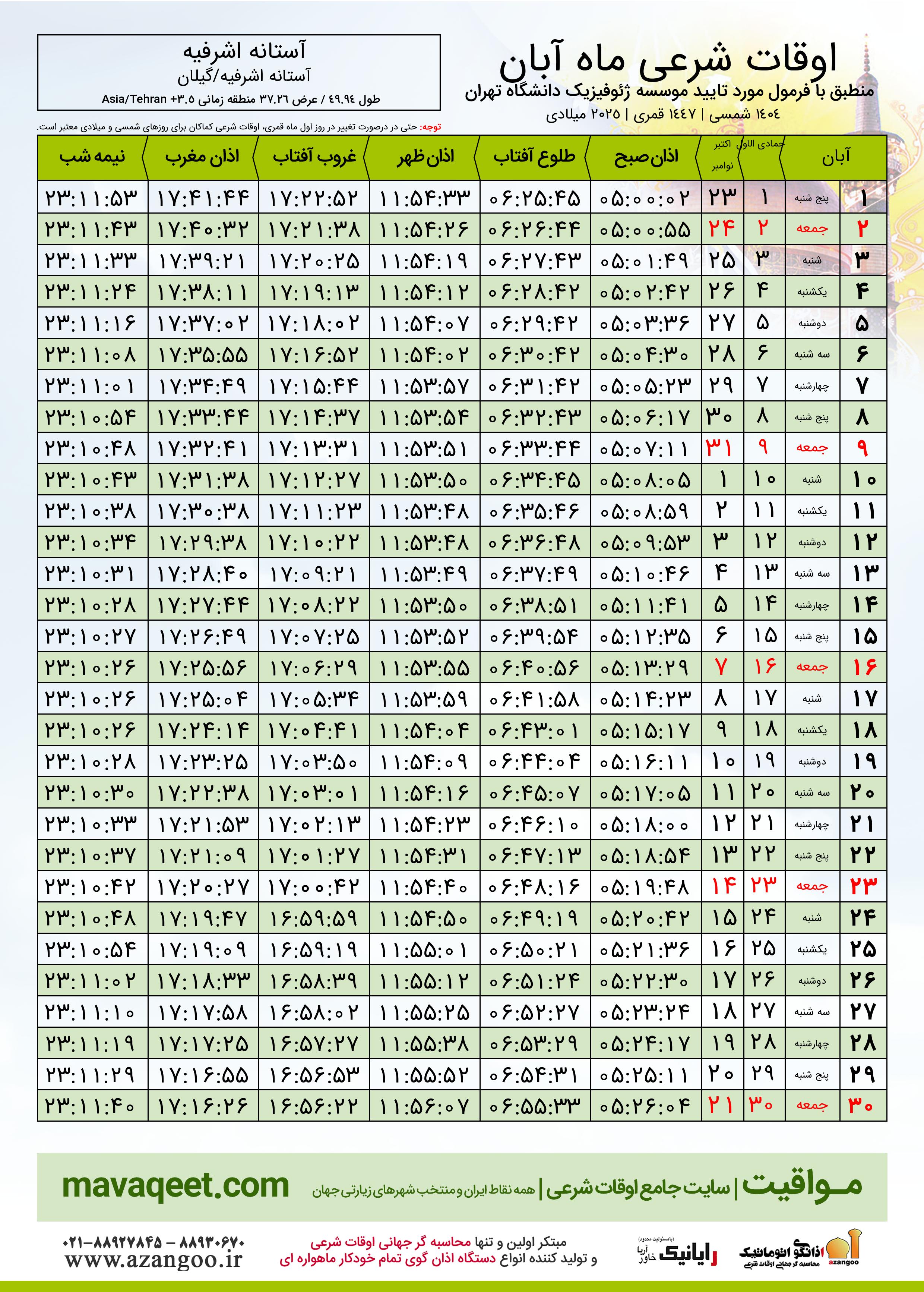 اوقات شرعی آبان ١٤٠٤ شمسی شهر آستانه اشرفیه