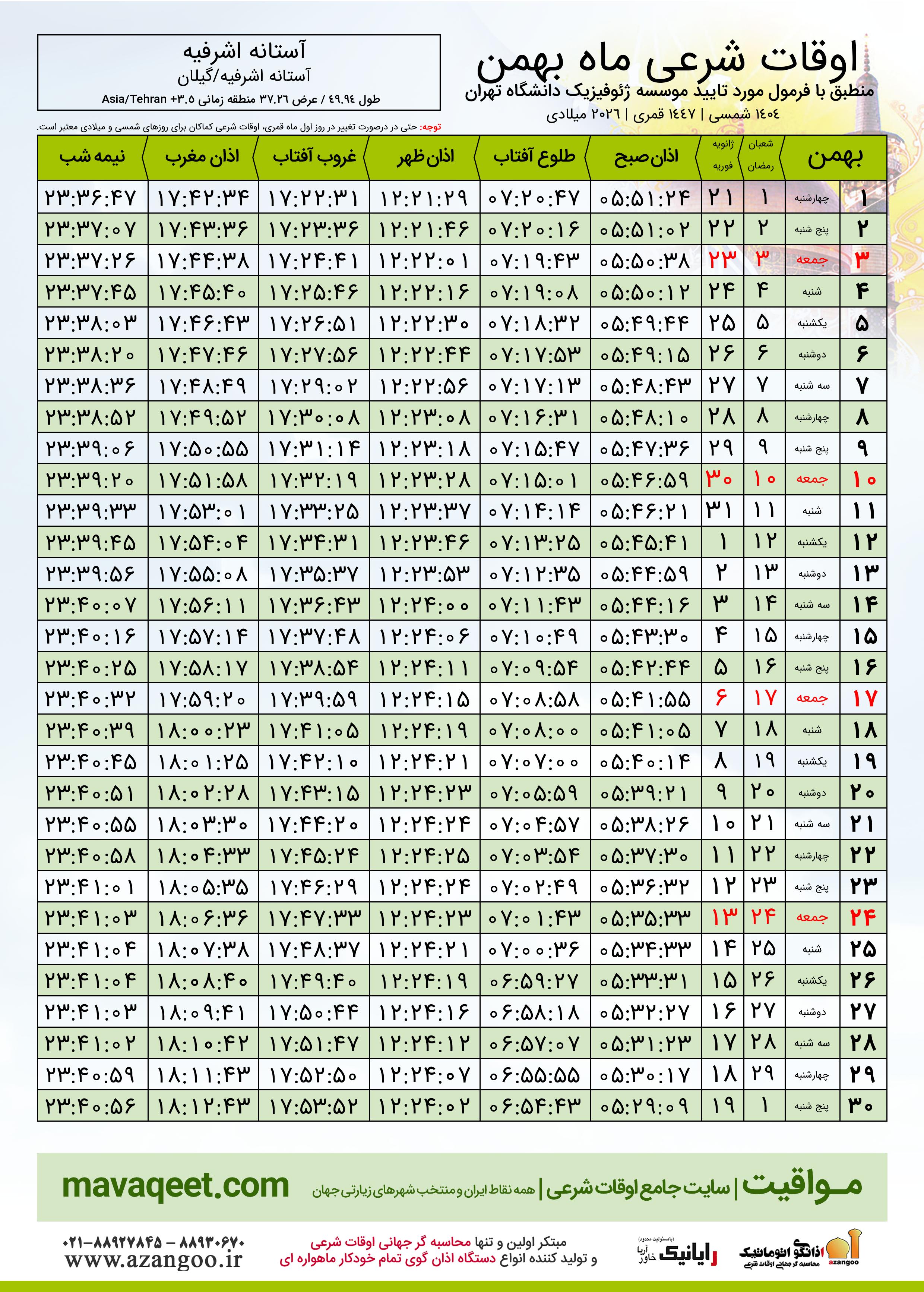 اوقات شرعی بهمن ١٤٠٤ شمسی شهر آستانه اشرفیه