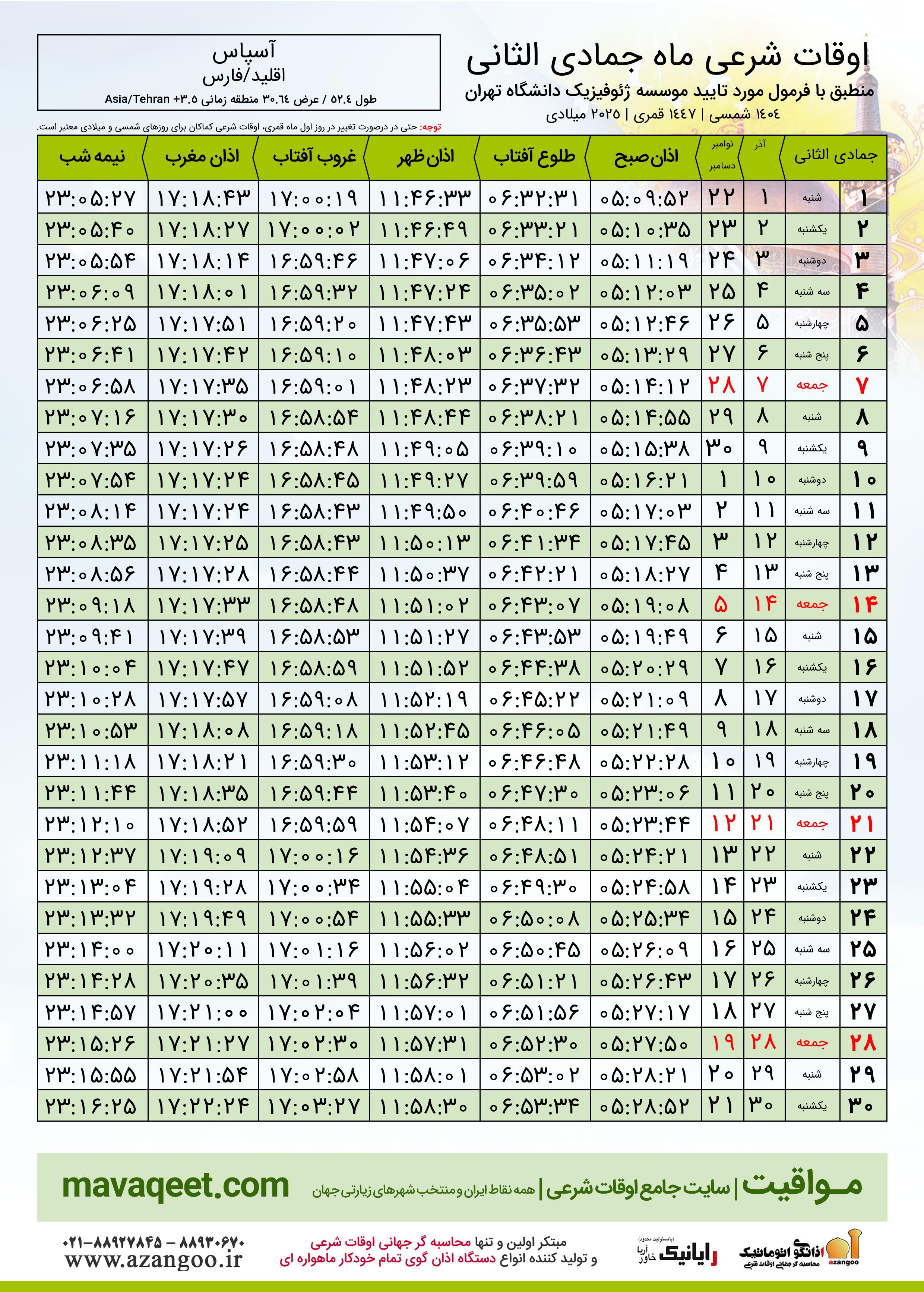 جدول اوقات شرعی جمادی الثانی ١٤٤٧ قمری شهر آسپاس