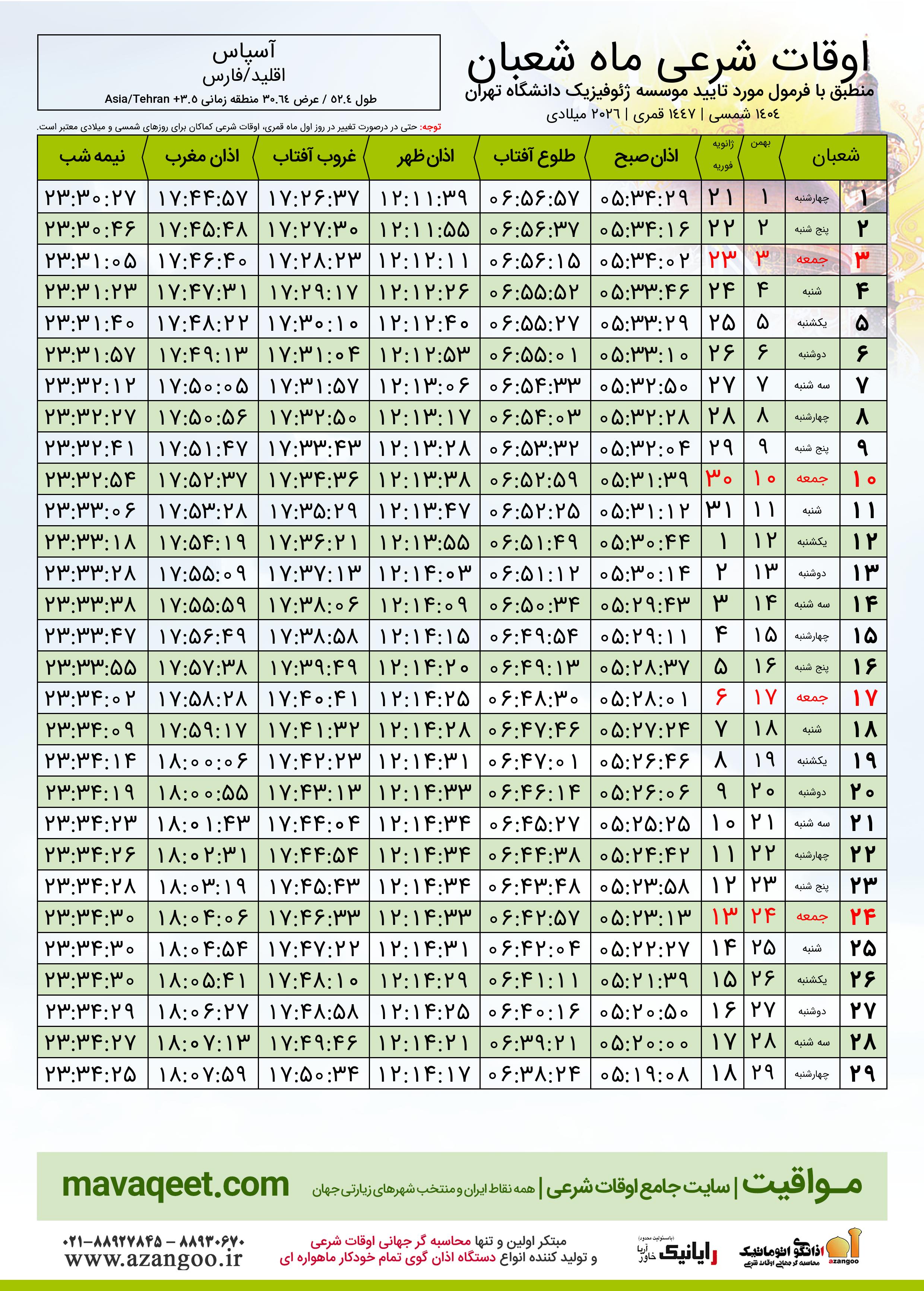 جدول اوقات شرعی شعبان ١٤٤٧ قمری شهر آسپاس