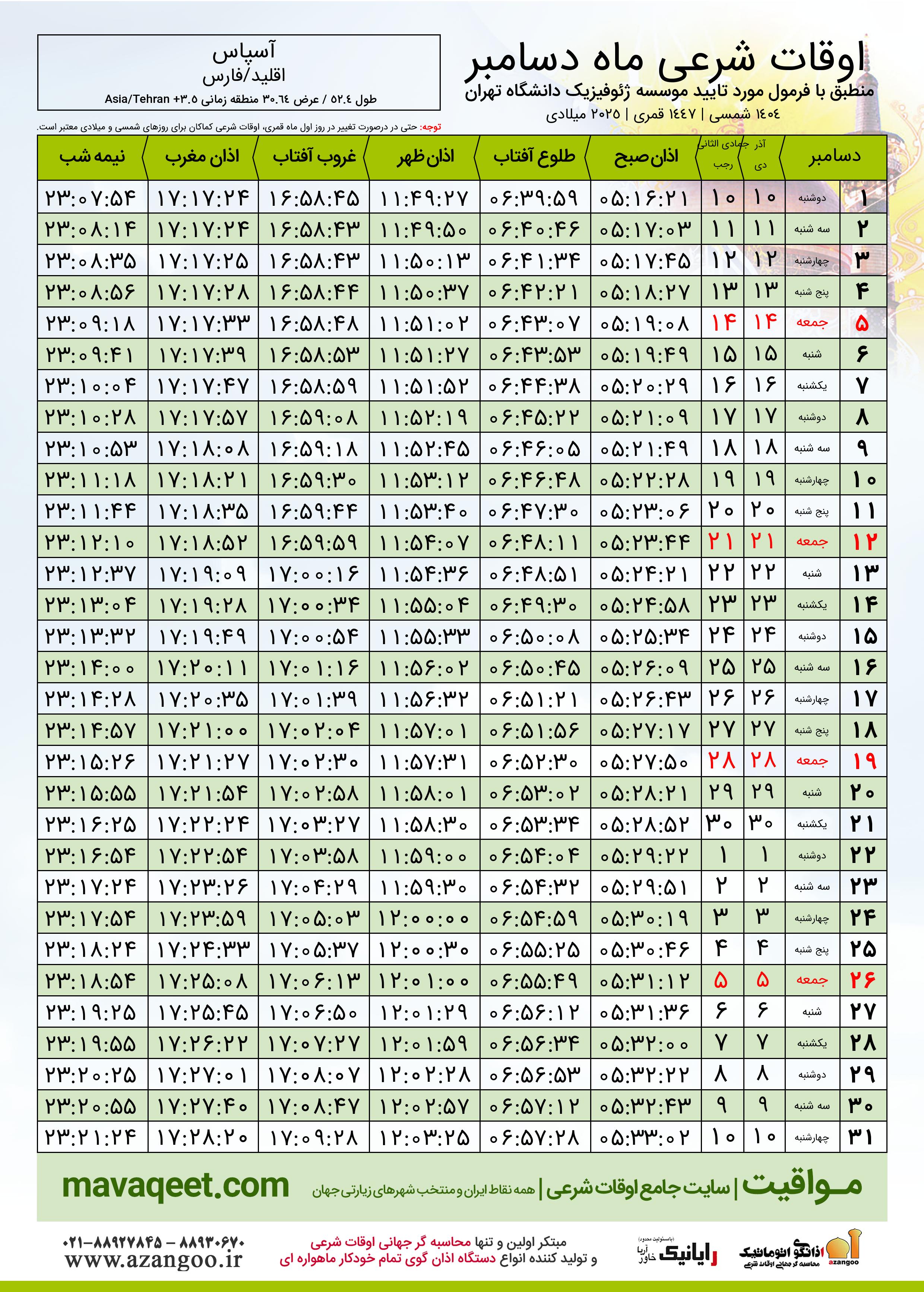 جدول اوقات شرعی دسامبر ٢٠٢٥ میلادی شهر آسپاس