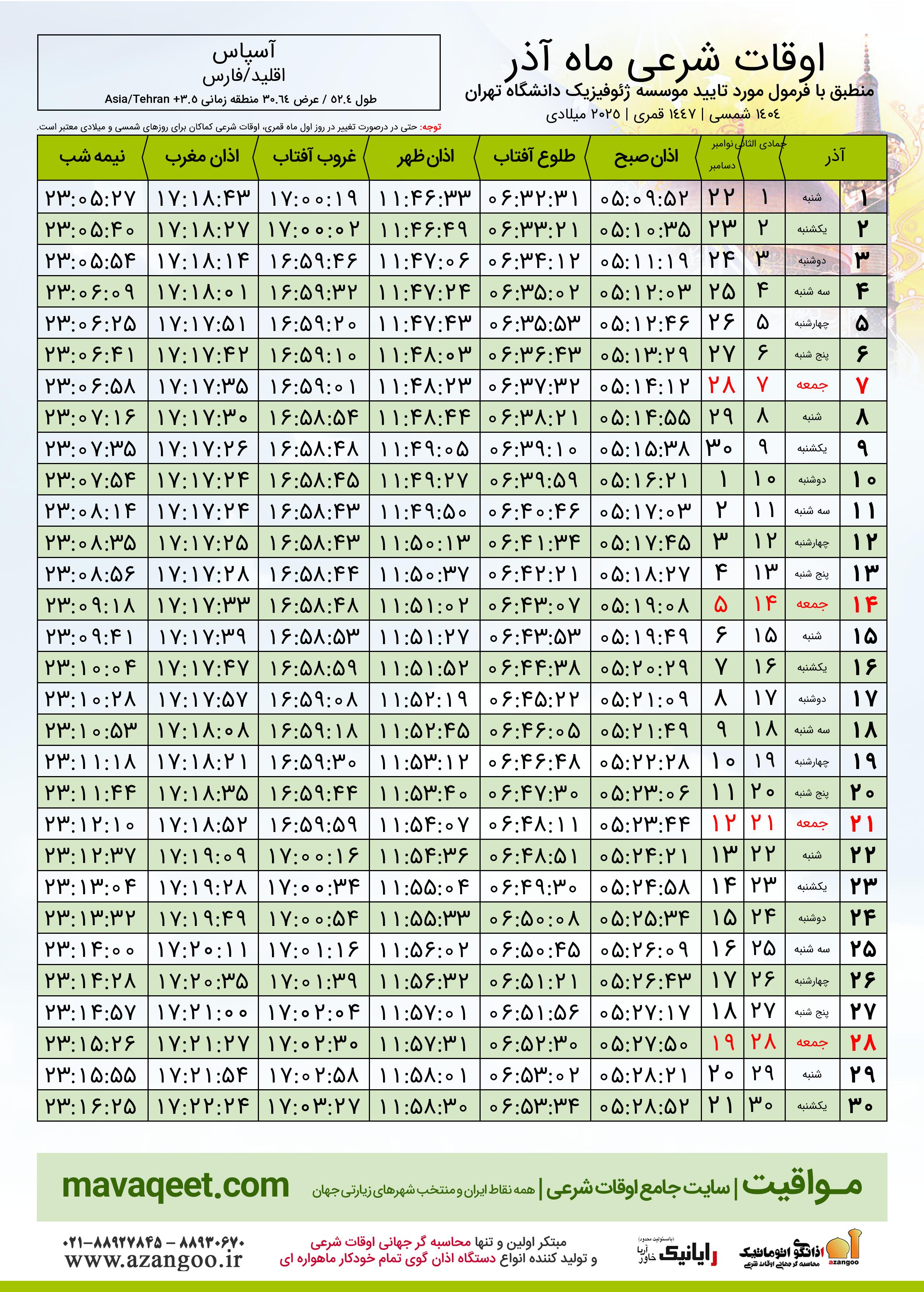 اوقات شرعی آذر ١٤٠٤ شمسی شهر آسپاس