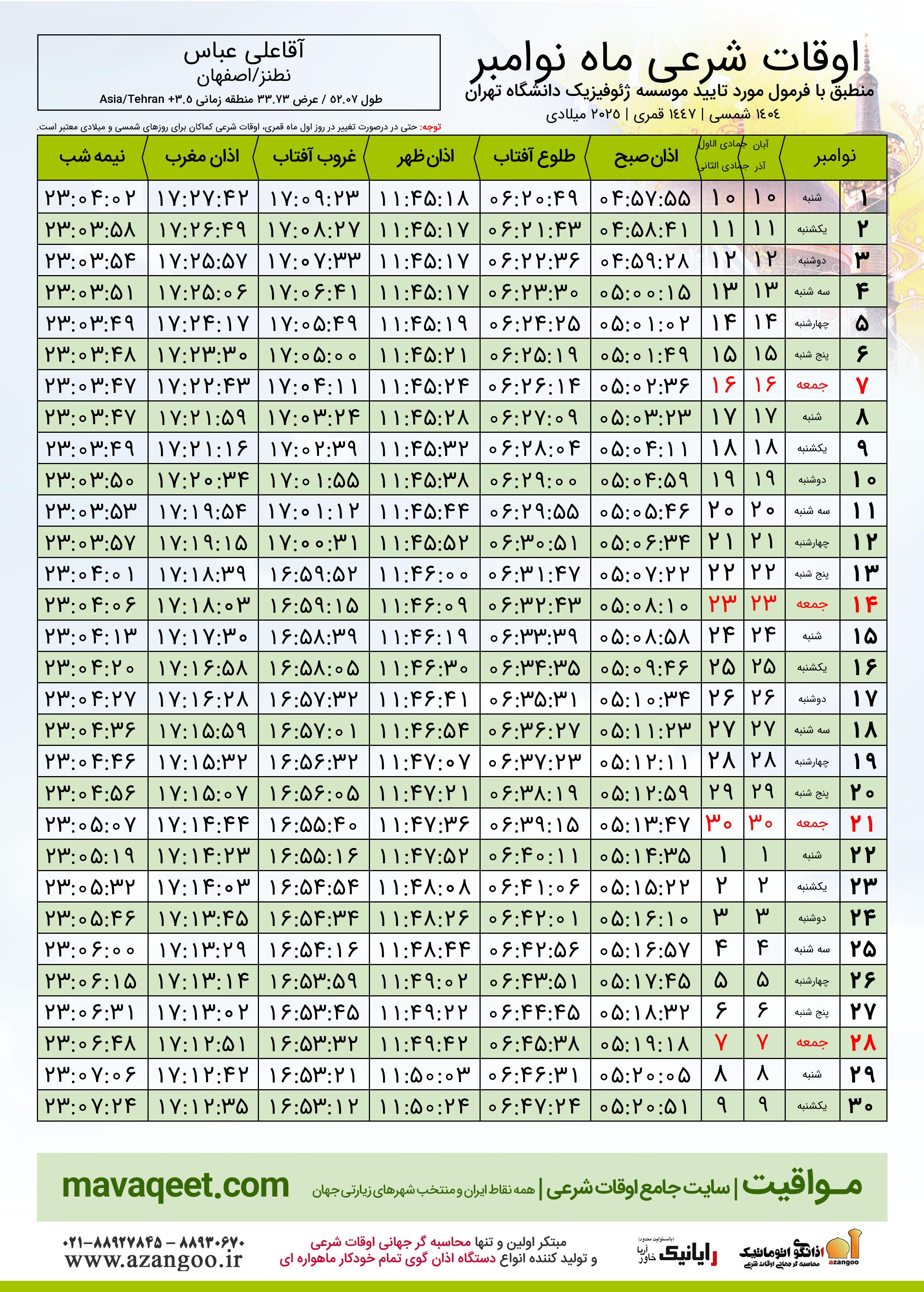 دانلود اوقات شرعی ماه رمضان ٠٤ - ١٤٠٤ شمسی | ٢٠٢٦ میلادی | ١٤٤٧ قمری شهر آقاعلی عباس