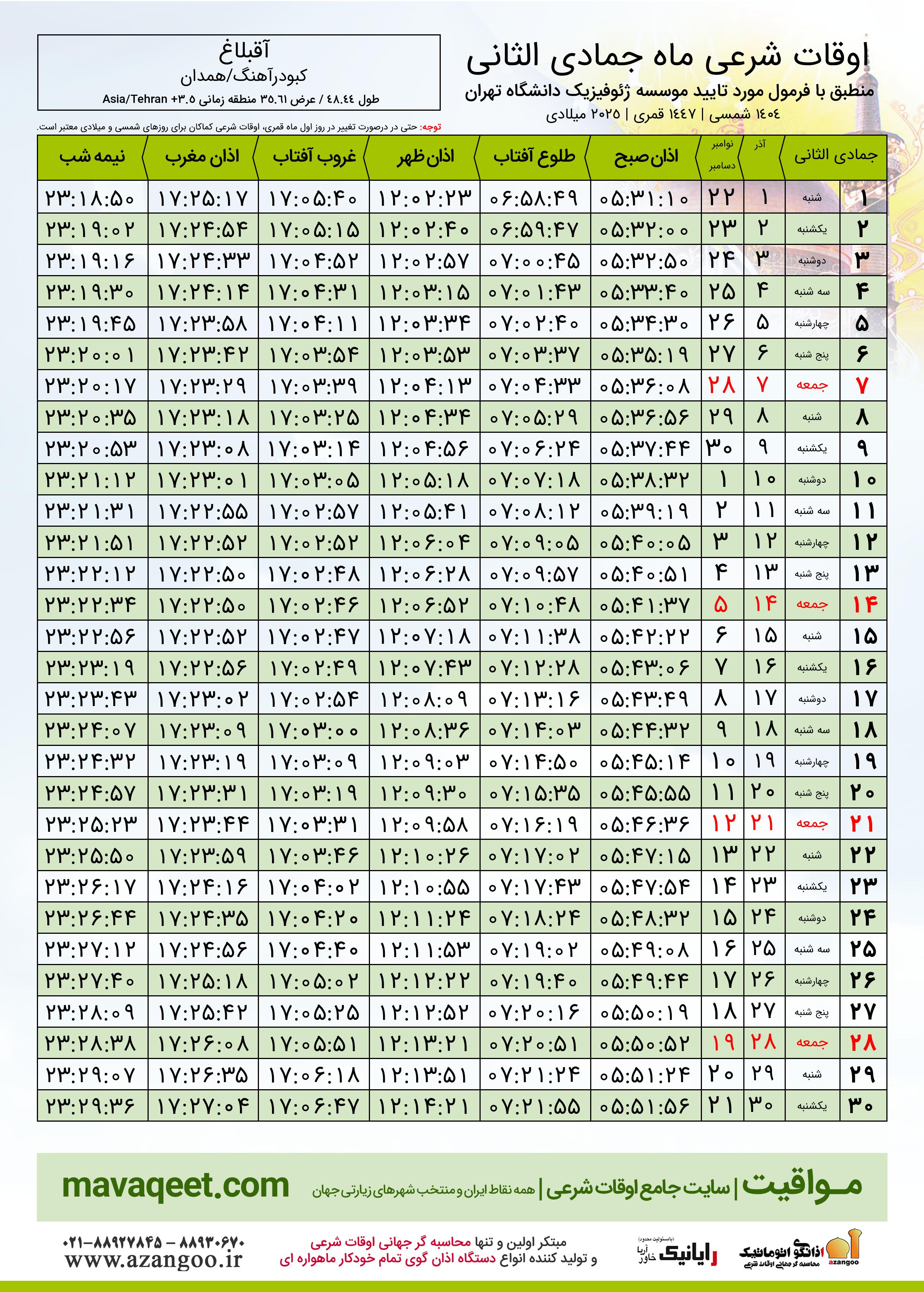 جدول اوقات شرعی جمادی الثانی ١٤٤٧ قمری شهر آقبلاغ