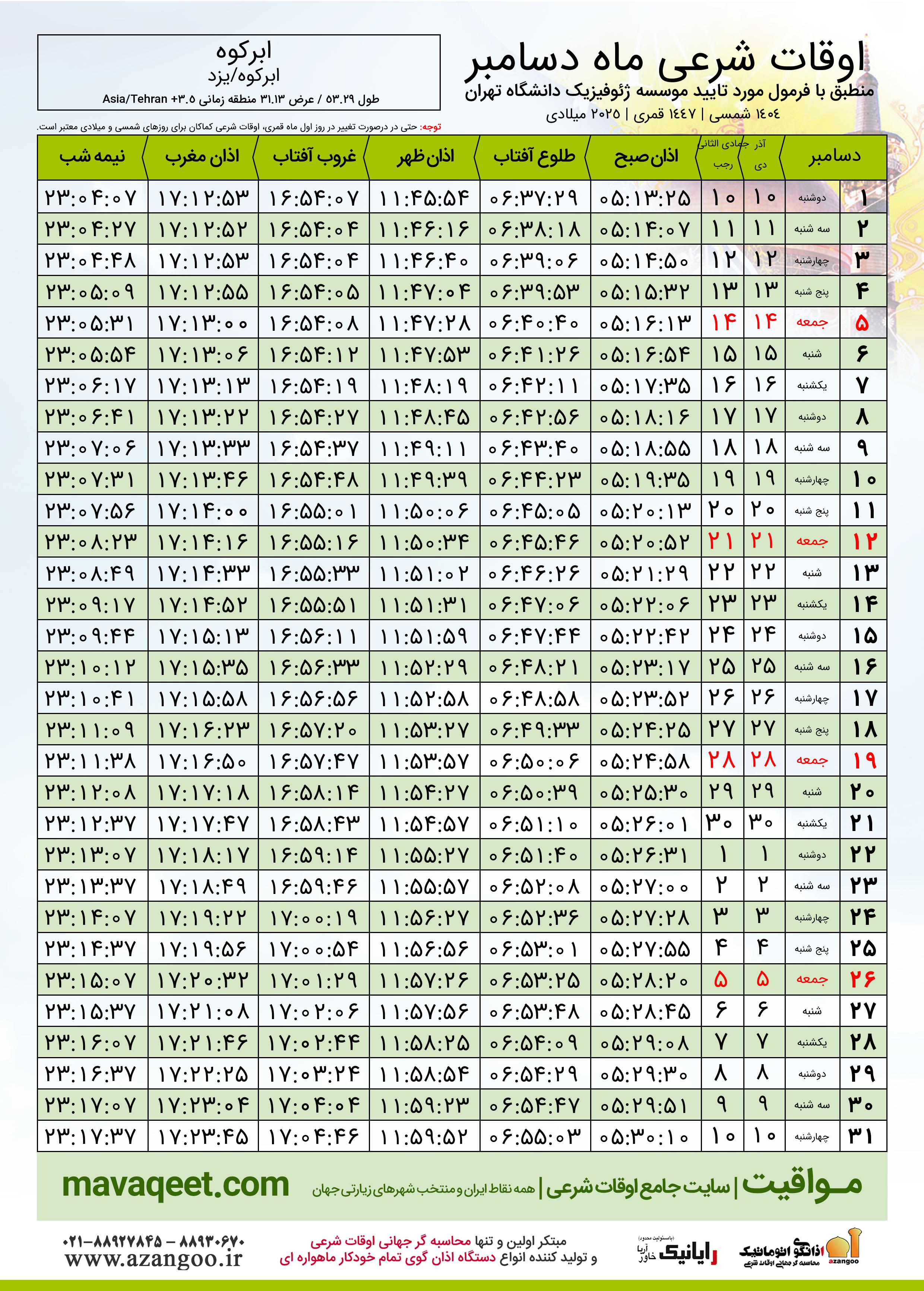 جدول اوقات شرعی دسامبر ٢٠٢٥ میلادی شهر ابرکوه
