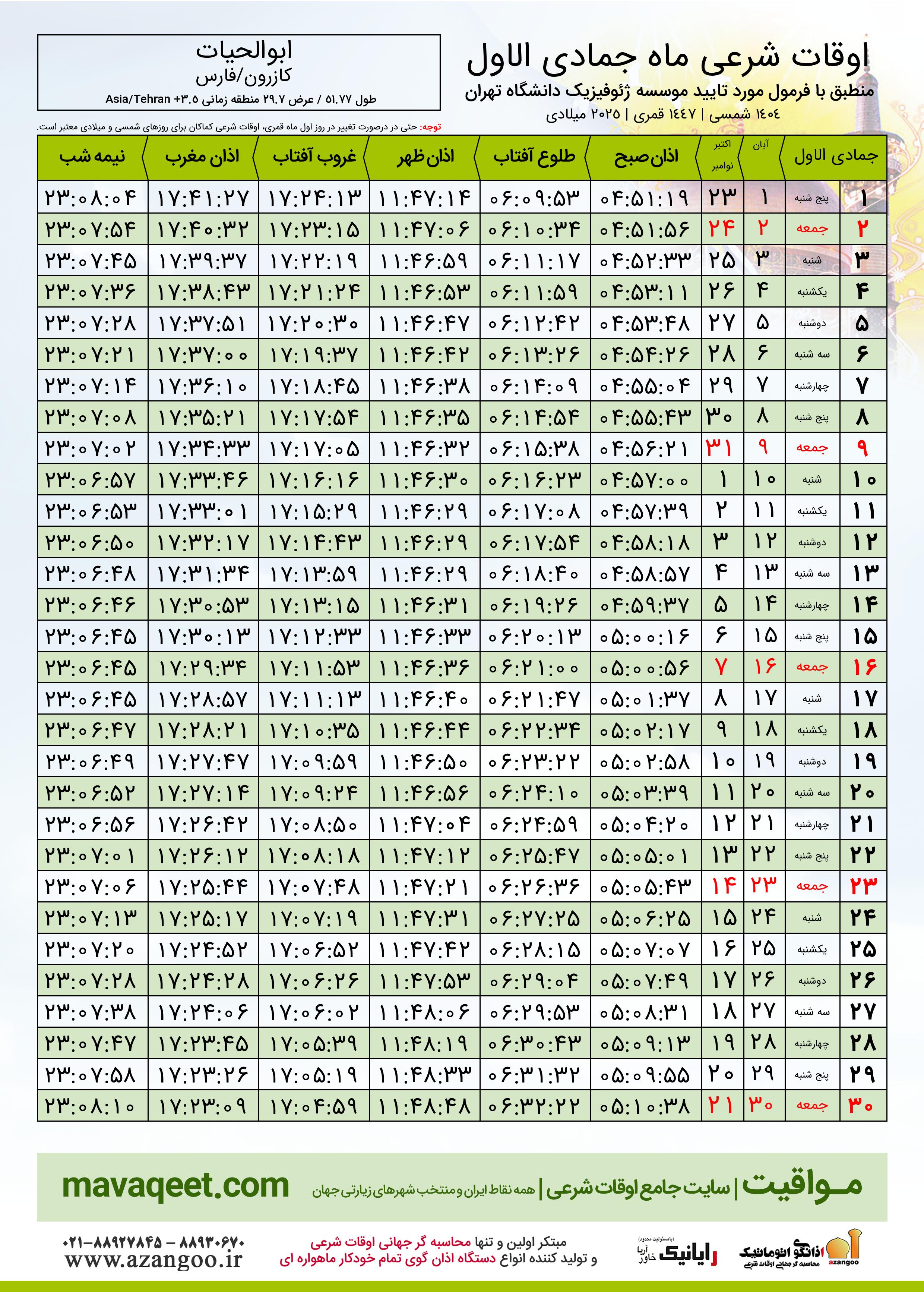 جدول اوقات شرعی جمادی الاول ١٤٤٧ قمری شهر ابوالحیات