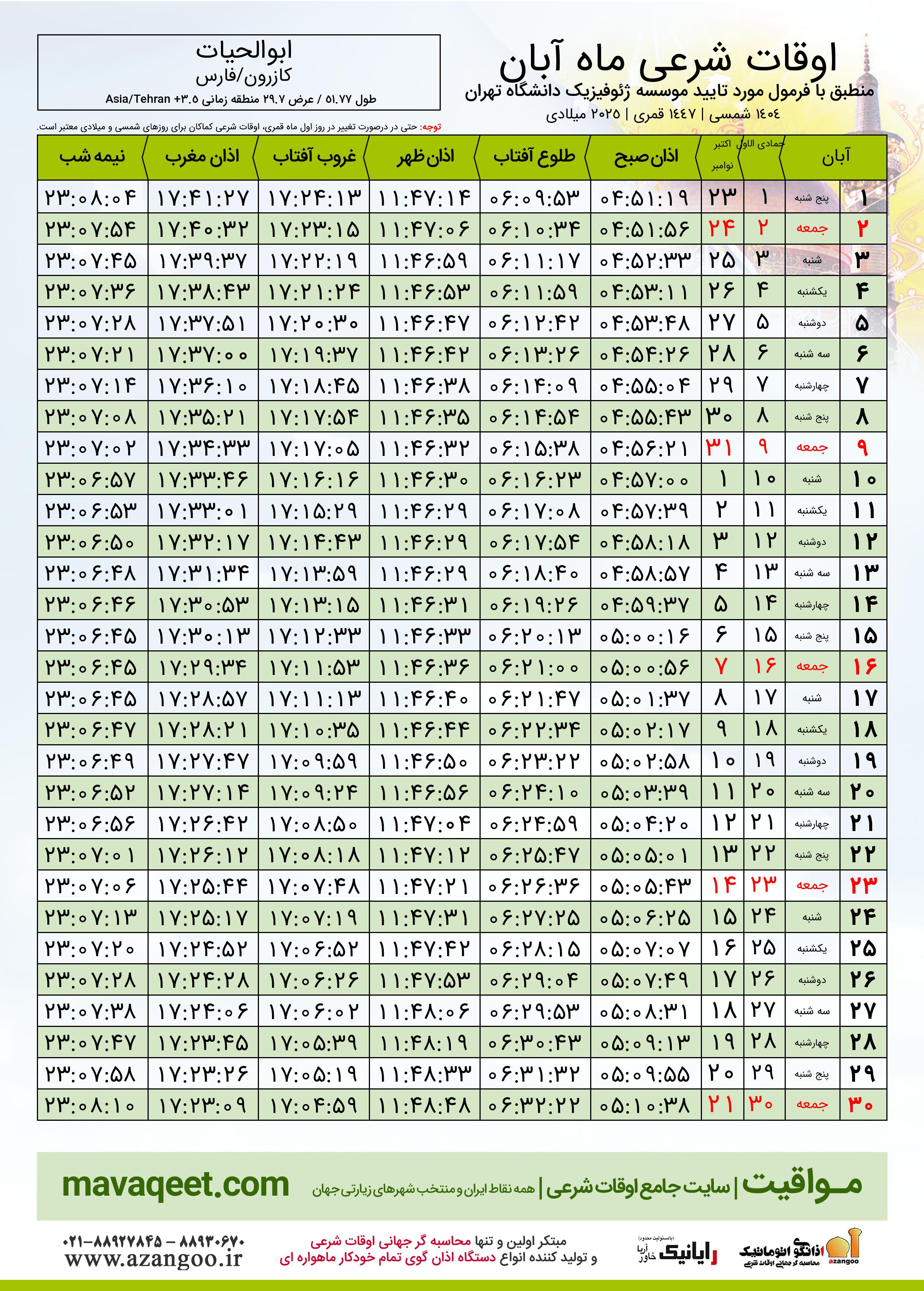 اوقات شرعی آبان ١٤٠٤ شمسی شهر ابوالحیات