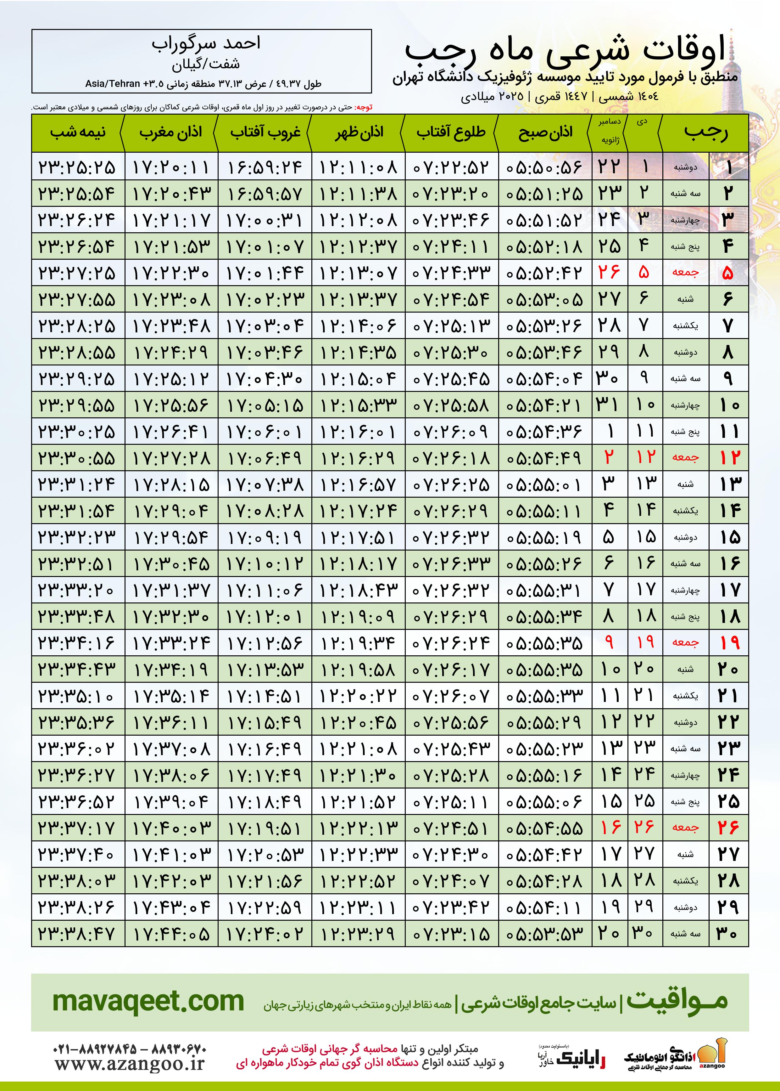 اوقات شرعی رجب ١٤٤٧ قمری شهر احمد سرگوراب