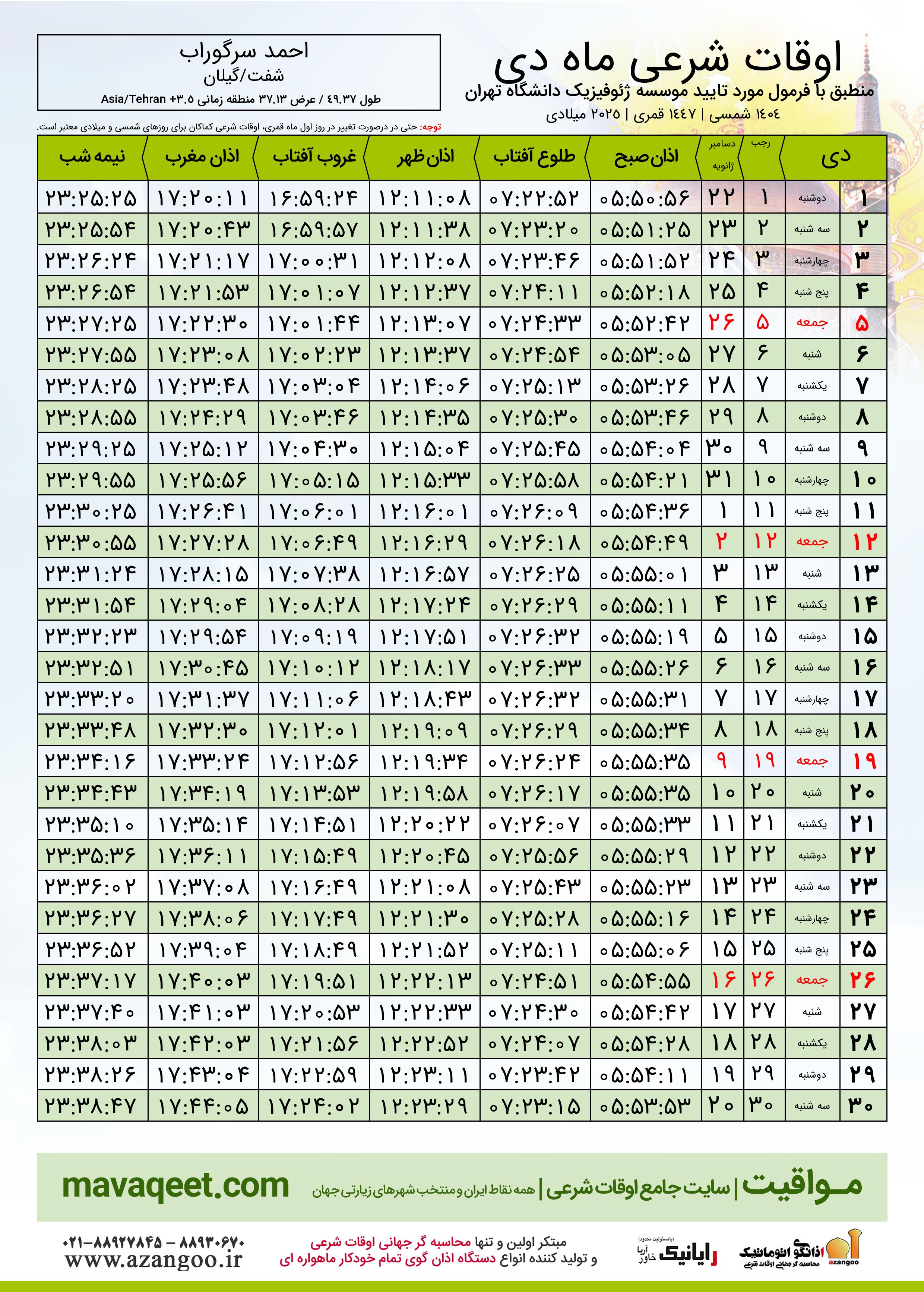 جهت نمایش تصویر جدول اوقات شرعی جدول اوقات شرعی دی ١٤٠٤ شمسی شهر احمد سرگوراب شهر احمد سرگوراب در اندازه