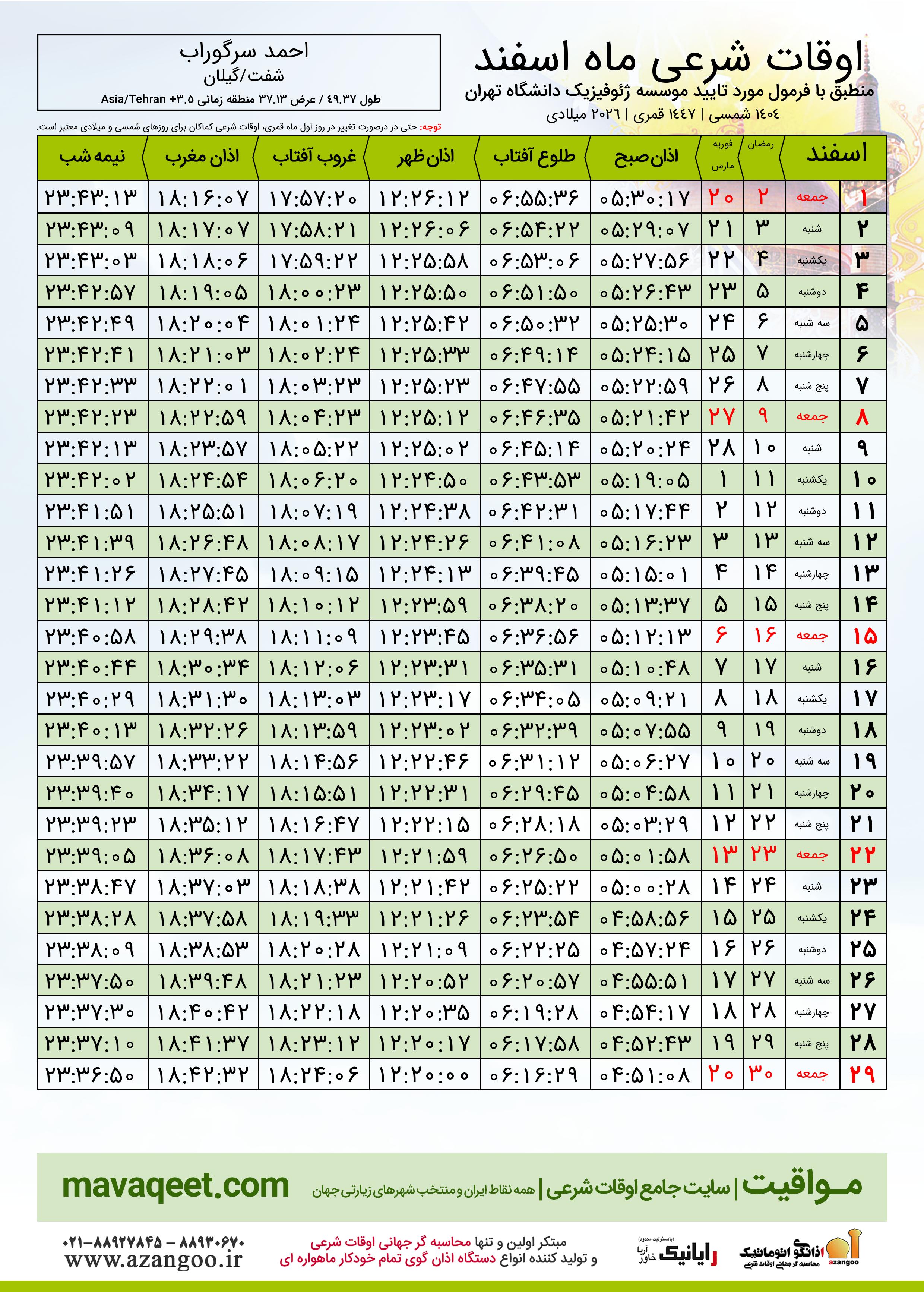 اوقات شرعی ماه رمضان شهر احمد سرگوراب ١٤٠٤ - ٠٤ شمسی | ٢٠٢٦ میلادی
