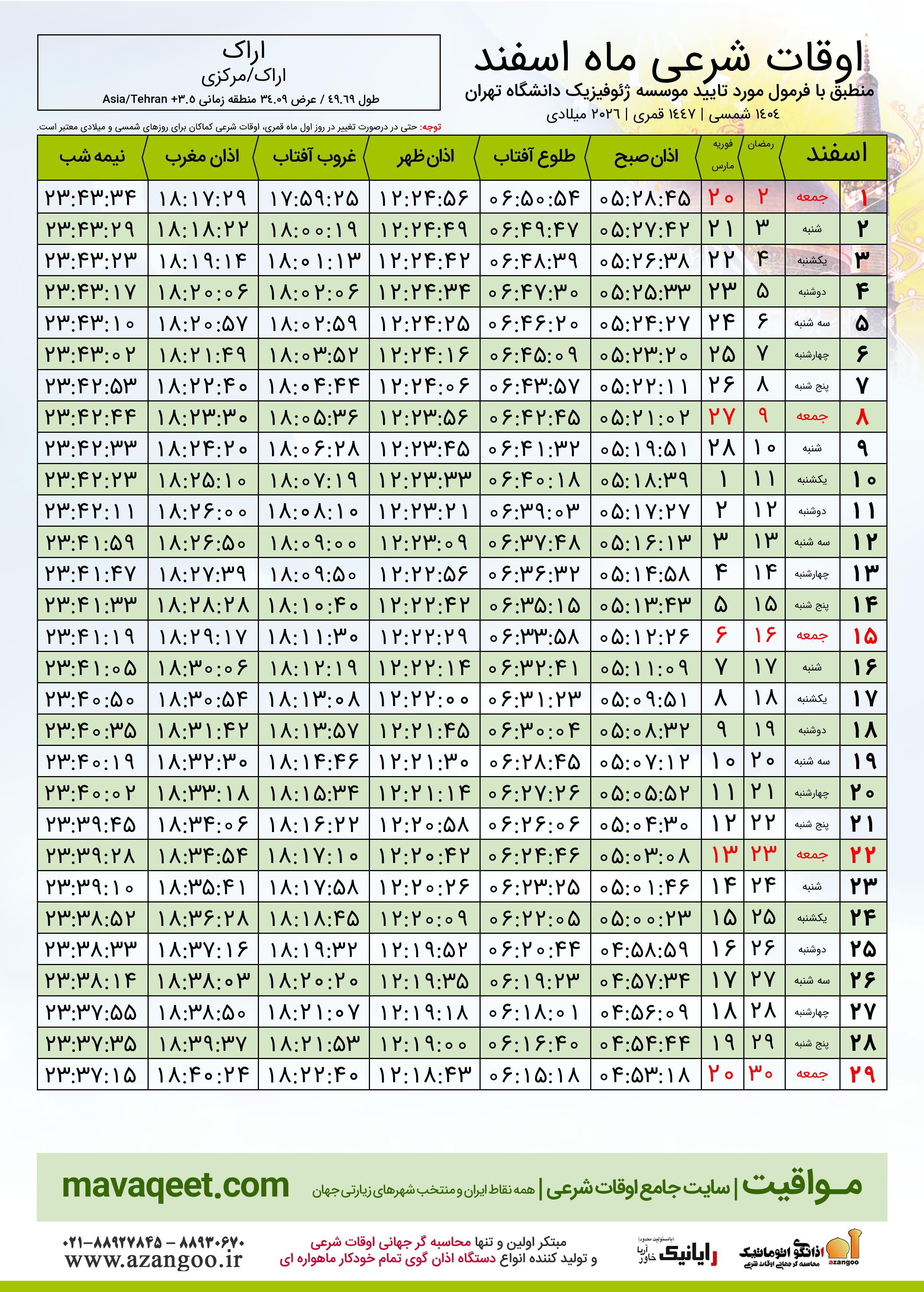 دانلود اوقات شرعی ماه رمضان ٠٤ - ١٤٠٤ شمسی | ٢٠٢٦ میلادی | ١٤٤٧ قمری شهر اراک