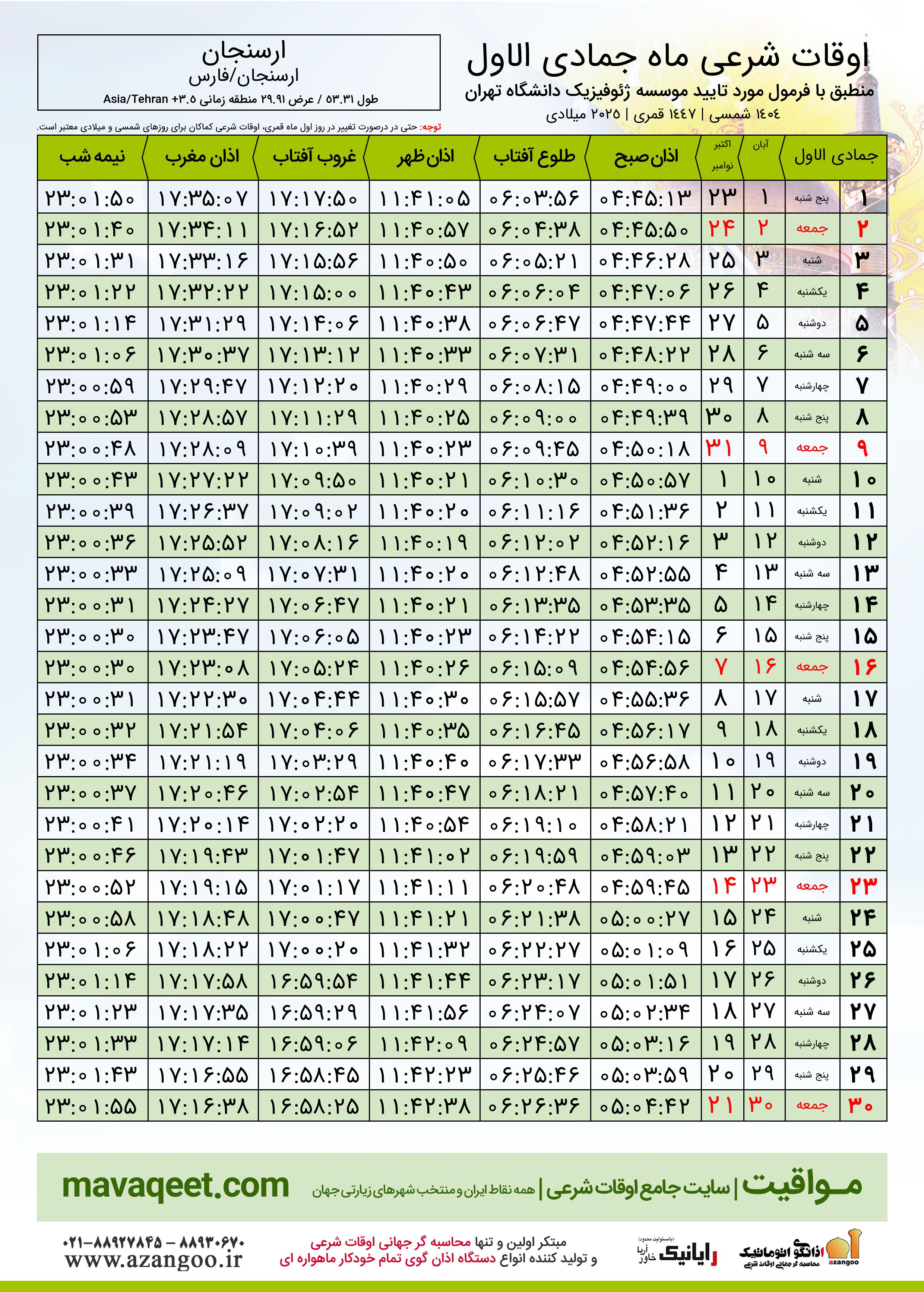 جدول اوقات شرعی جمادی الاول ١٤٤٧ قمری شهر ارسنجان