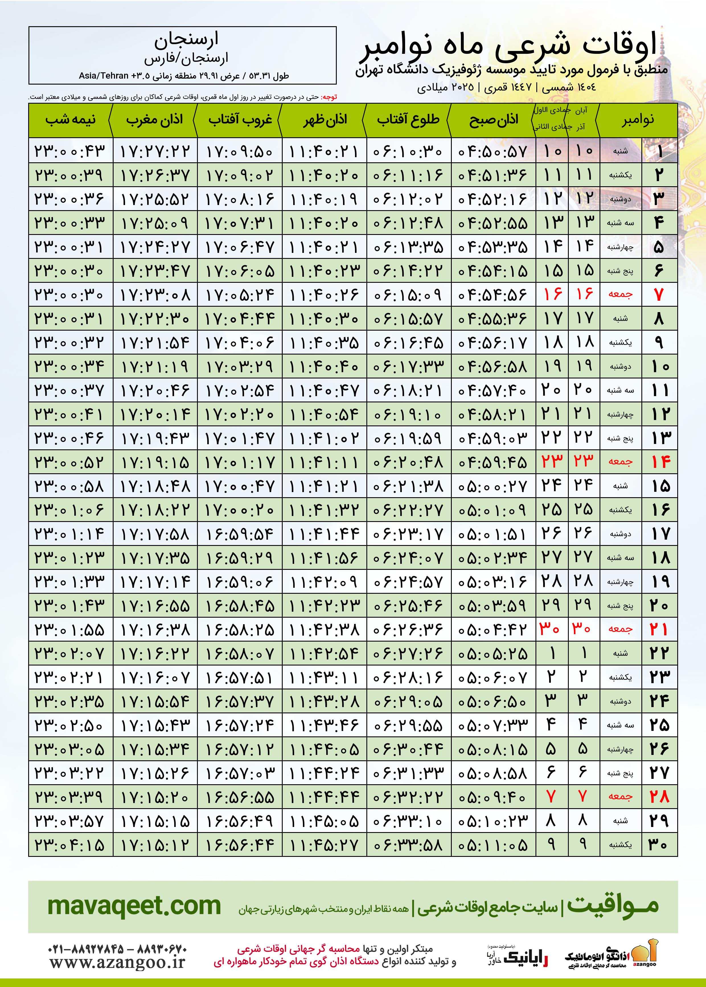 دانلود اوقات شرعی نوامبر ٢٠٢٥ شهر ارسنجان