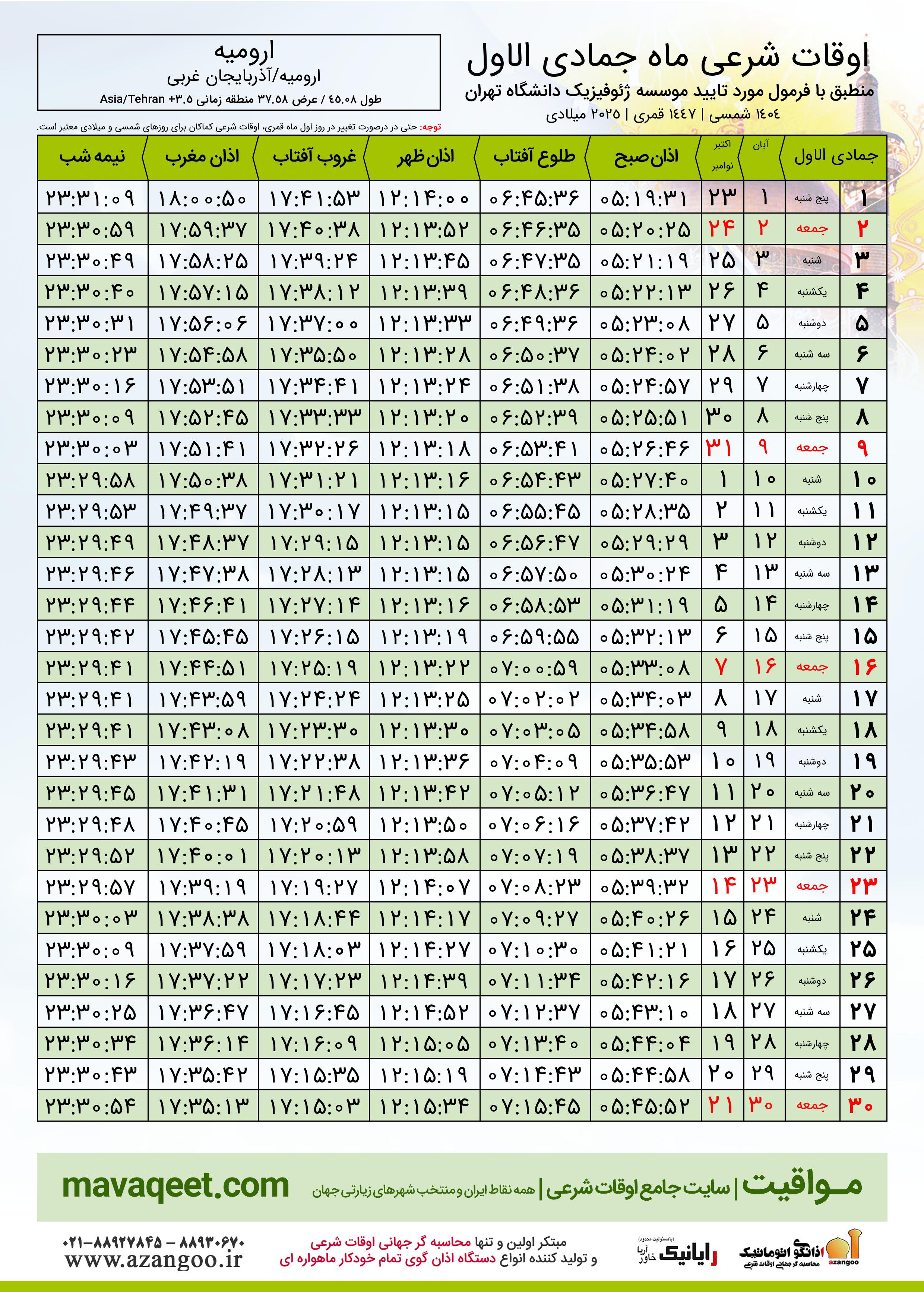جدول اوقات شرعی جمادی الاول ١٤٤٧ قمری شهر ارومیه