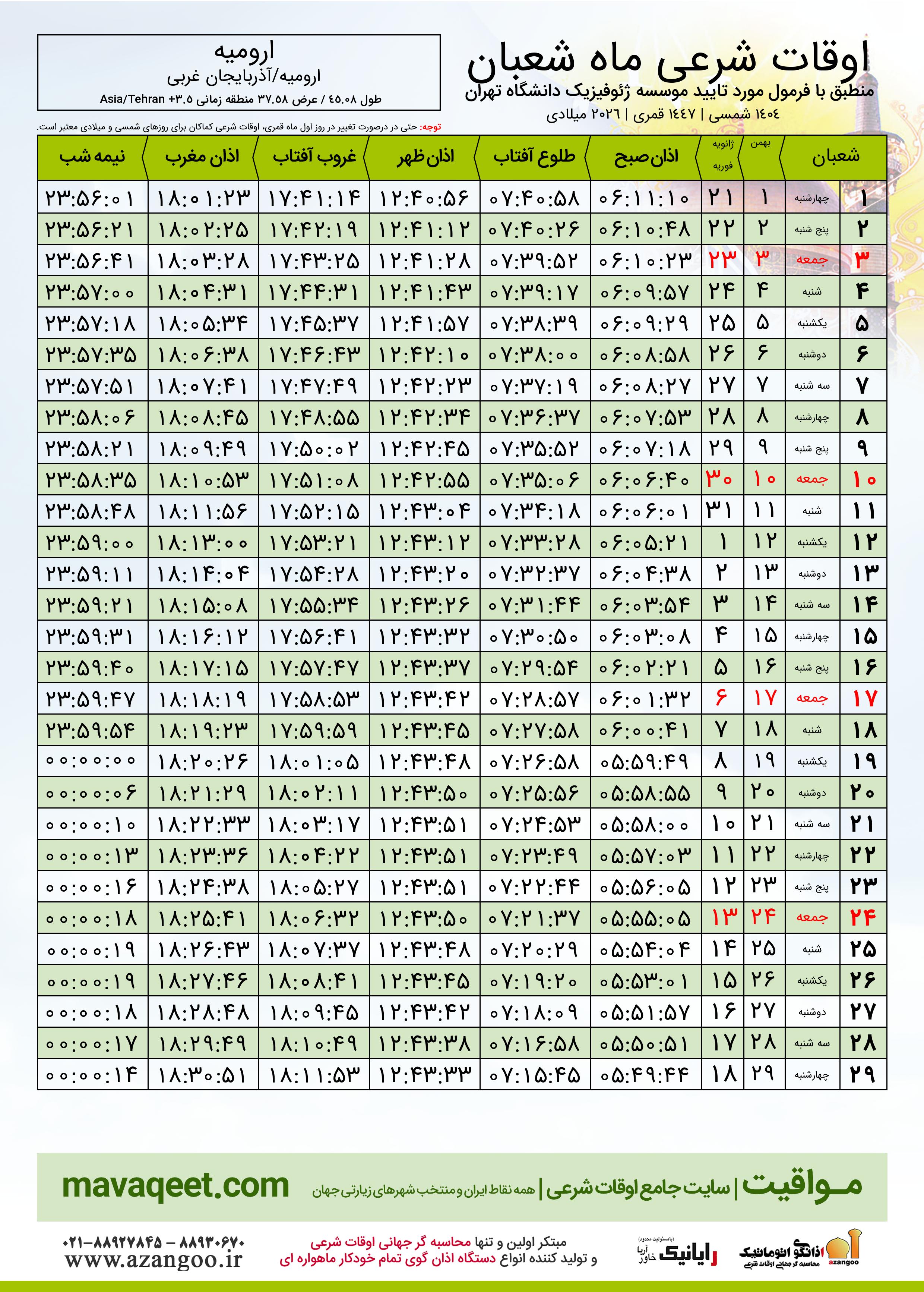 اوقات شرعی ماه شعبان ١٤٤٧ هـ.ق شهر ارومیه بر