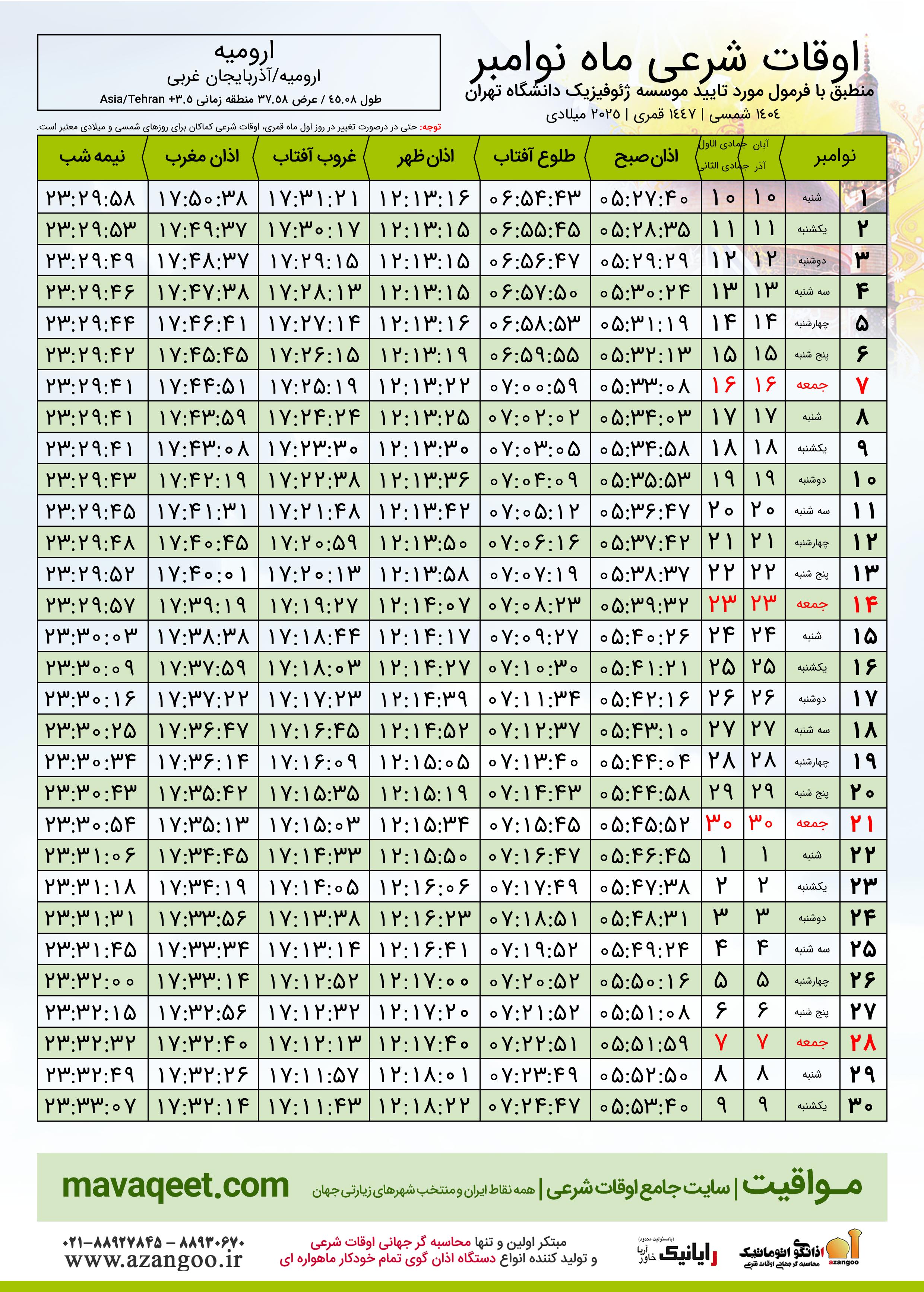 جدول اوقات شرعی نوامبر ٢٠٢٥ میلادی شهر ارومیه