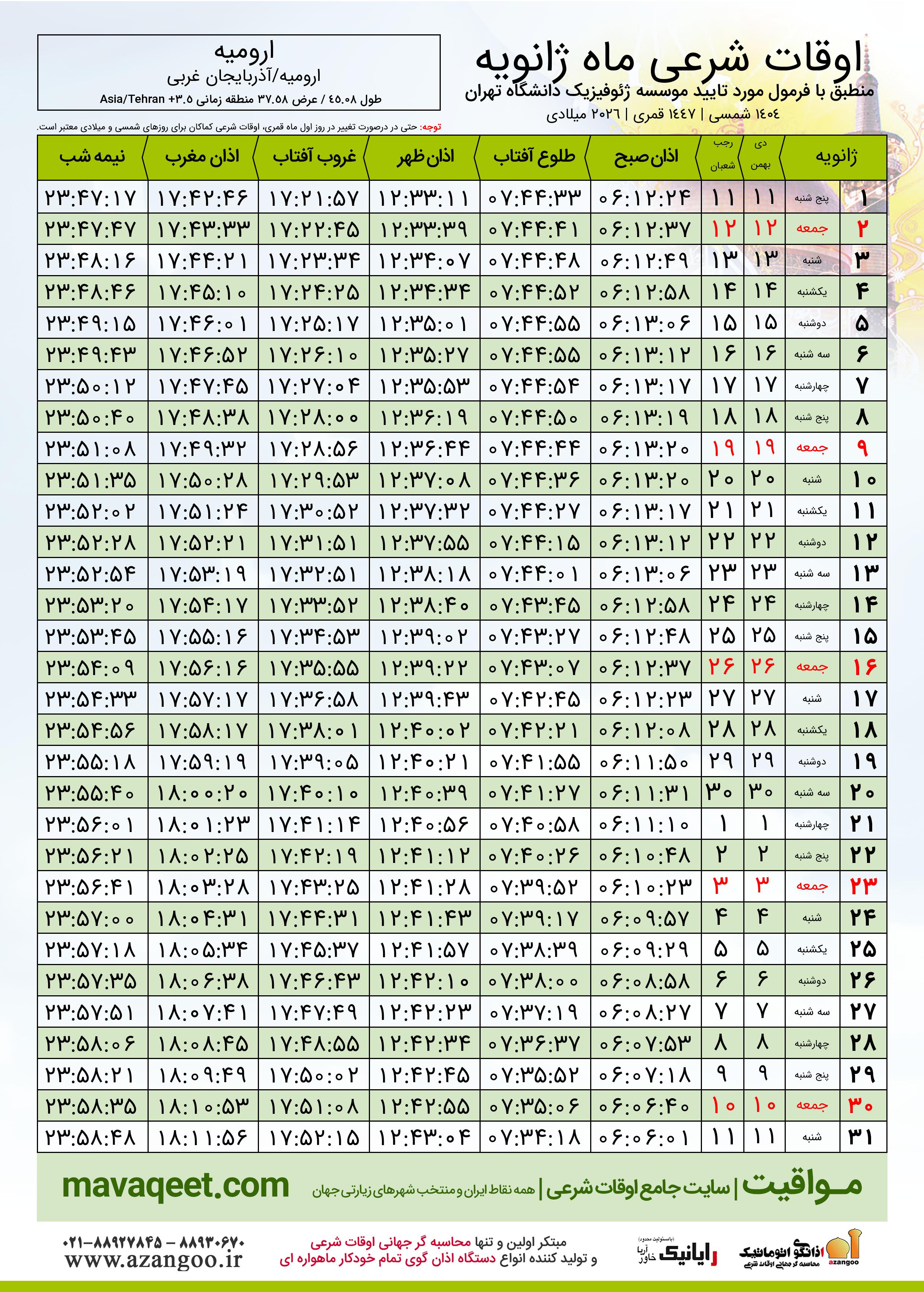 دانلود اوقات شرعی ژانویه ٢٠٢٦ شهر ارومیه