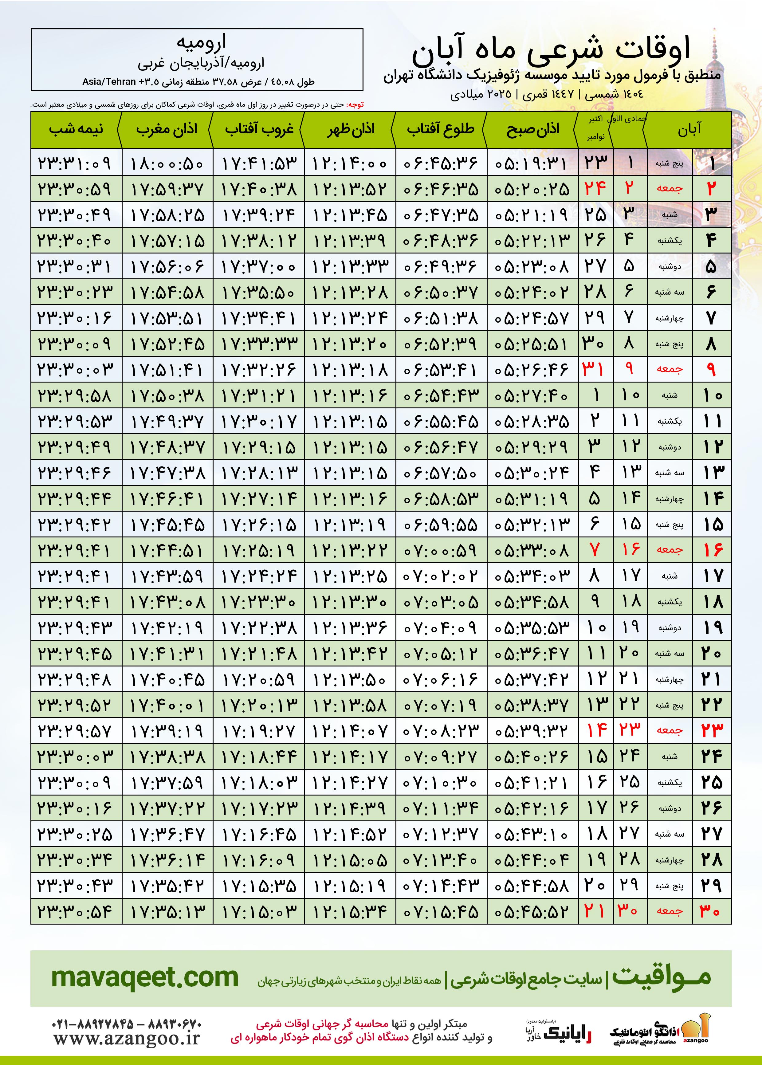 اوقات شرعی آبان ١٤٠٤ شمسی شهر ارومیه