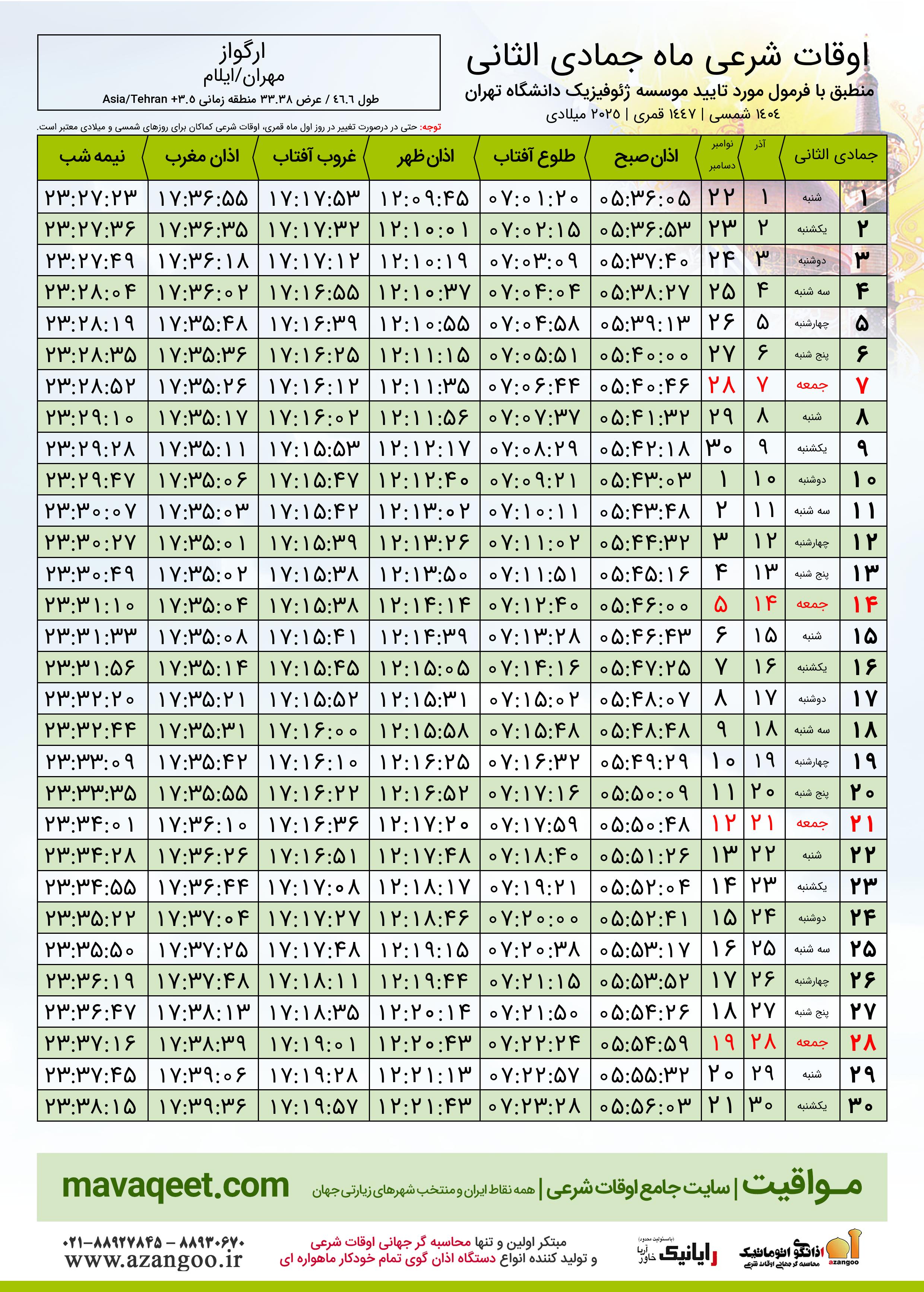 جدول اوقات شرعی جمادی الثانی ١٤٤٧ قمری شهر ارگواز