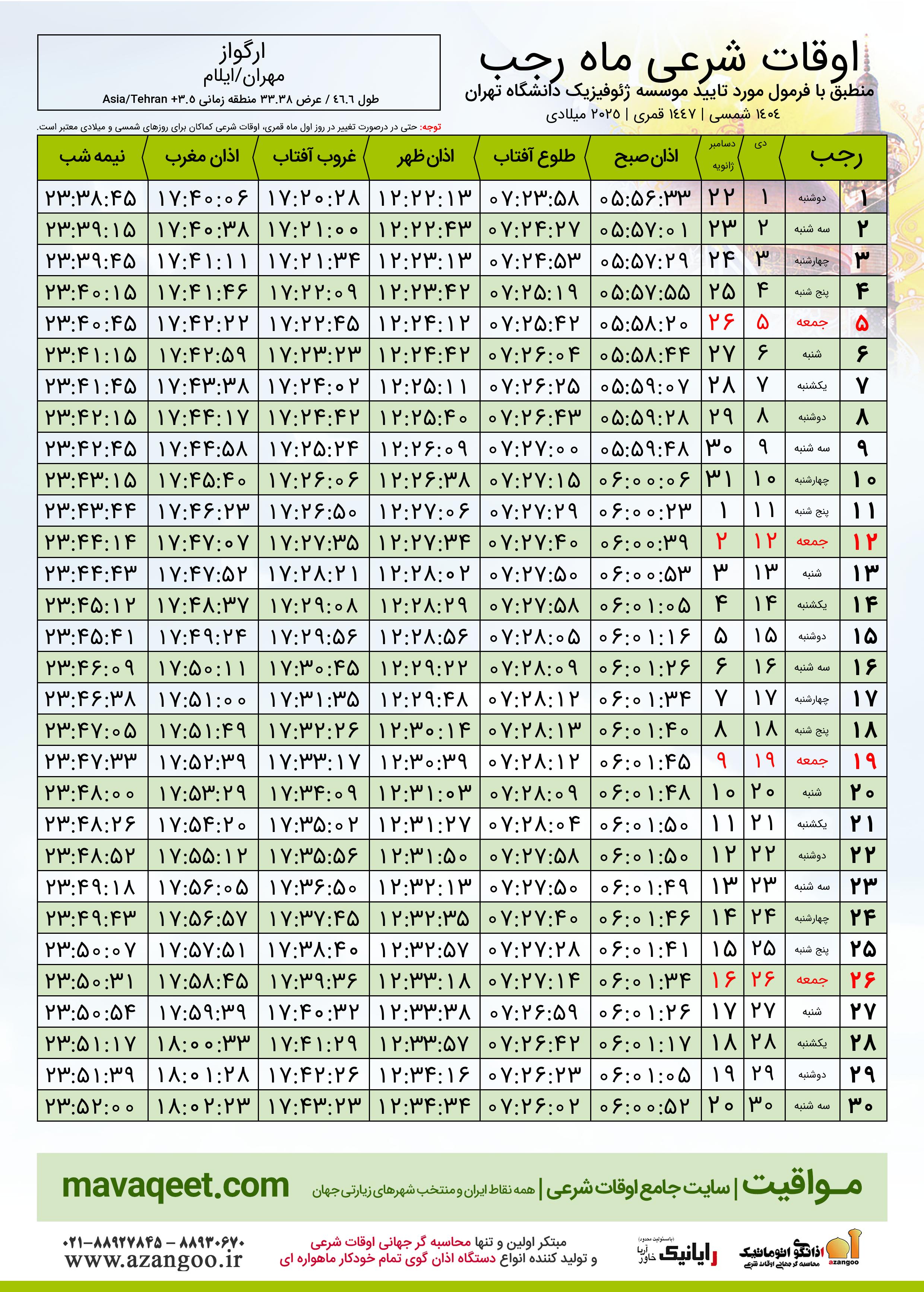 اوقات شرعی ماه رجب ١٤٤٧ هـ.ق شهر ارگواز بر