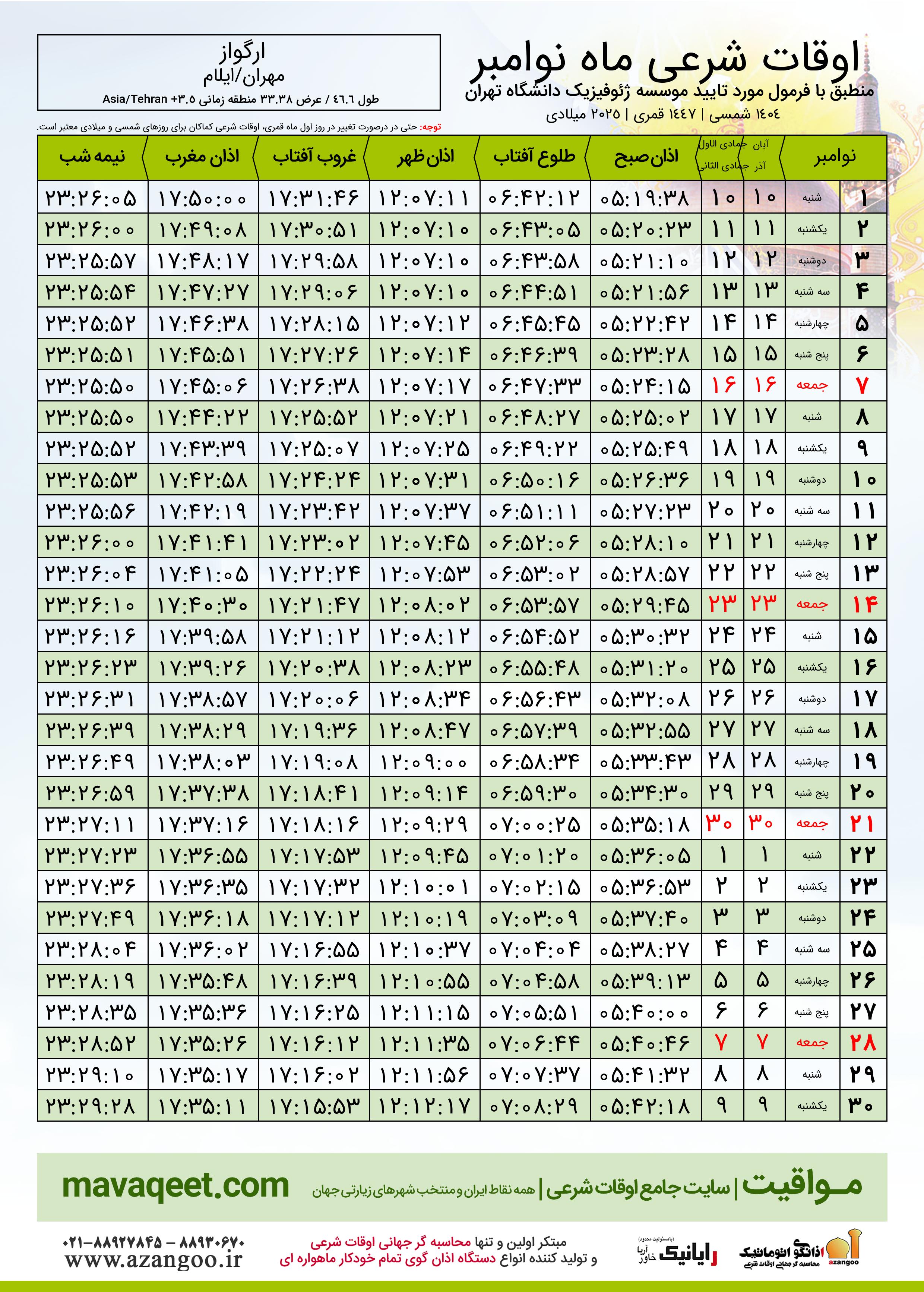 جدول اوقات شرعی نوامبر ٢٠٢٥ میلادی شهر ارگواز