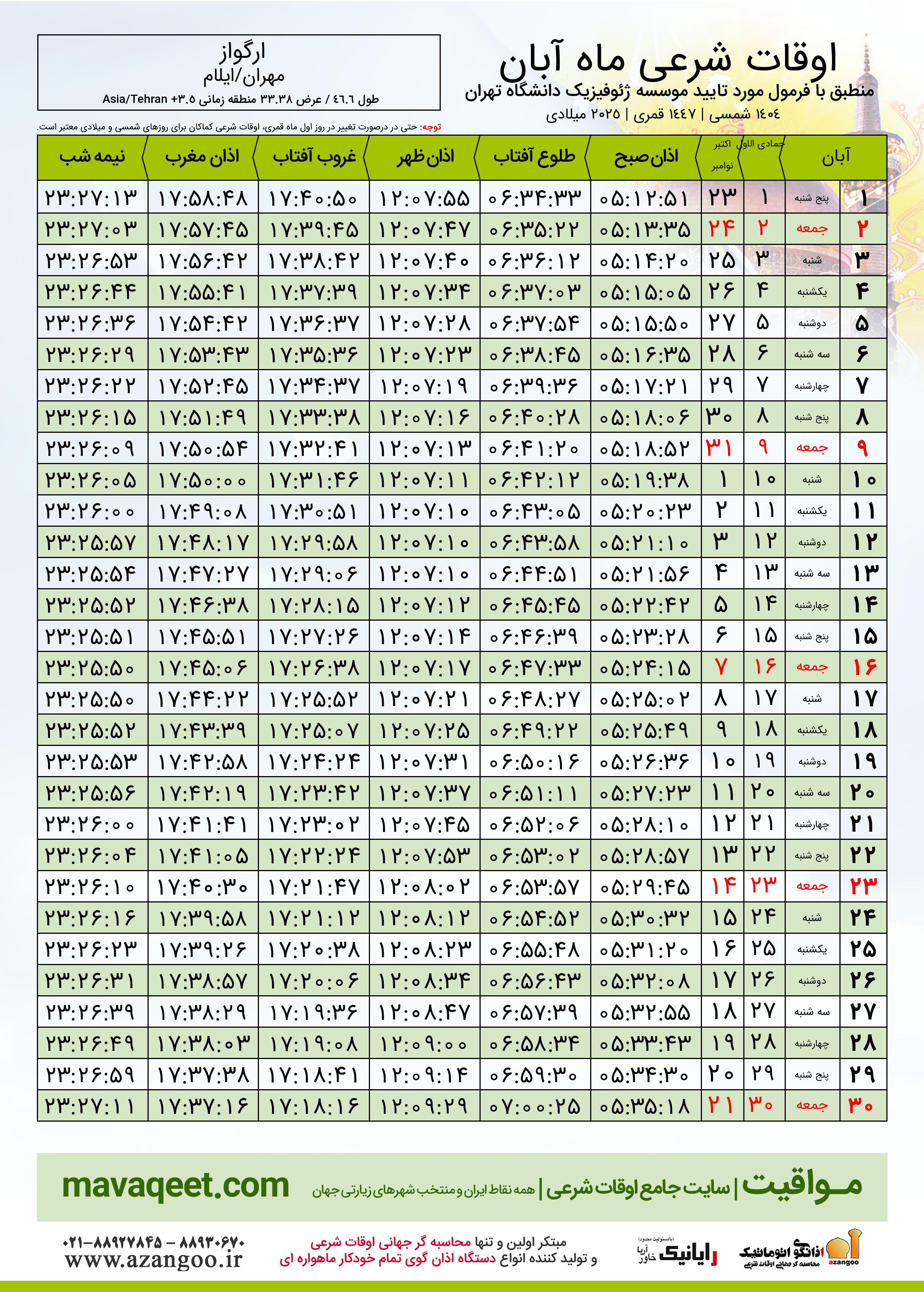جدول اوقات شرعی آبان ١٤٠٤ شمسی شهر ارگواز