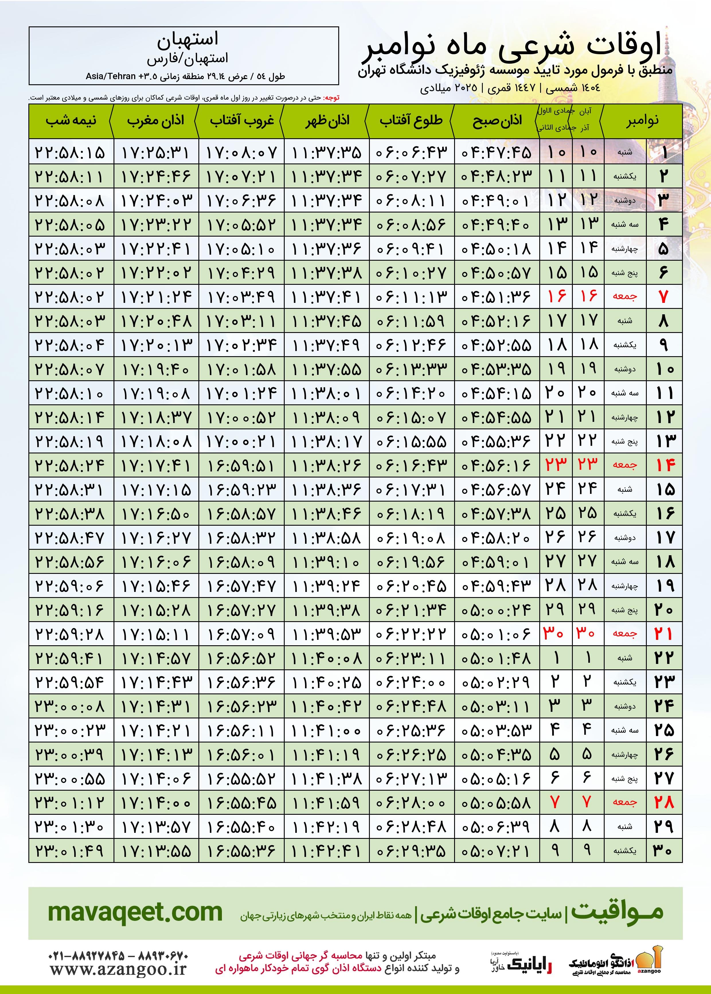 جدول اوقات شرعی نوامبر ٢٠٢٥ میلادی شهر استهبان