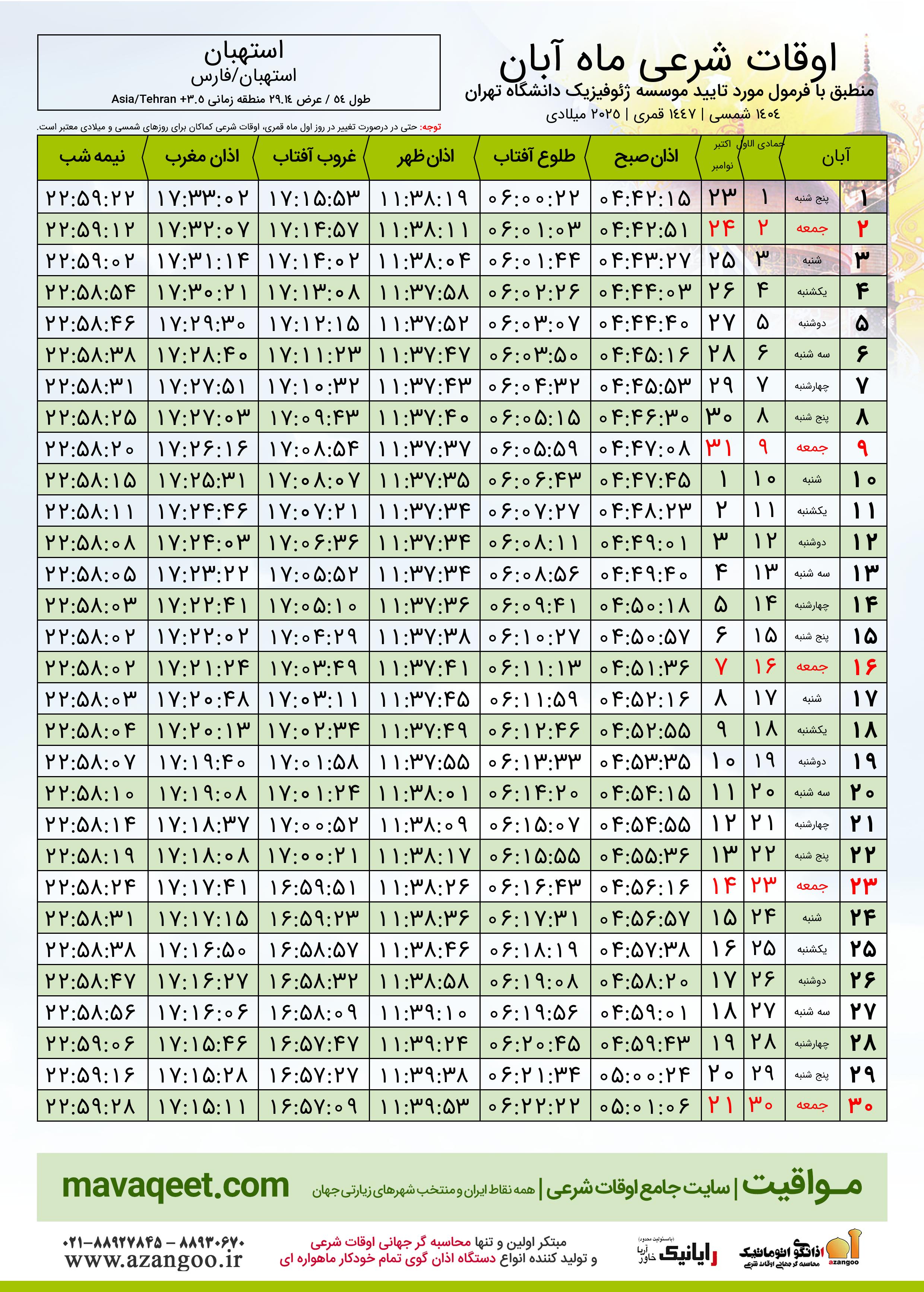 اوقات شرعی آبان ١٤٠٤ شمسی شهر استهبان