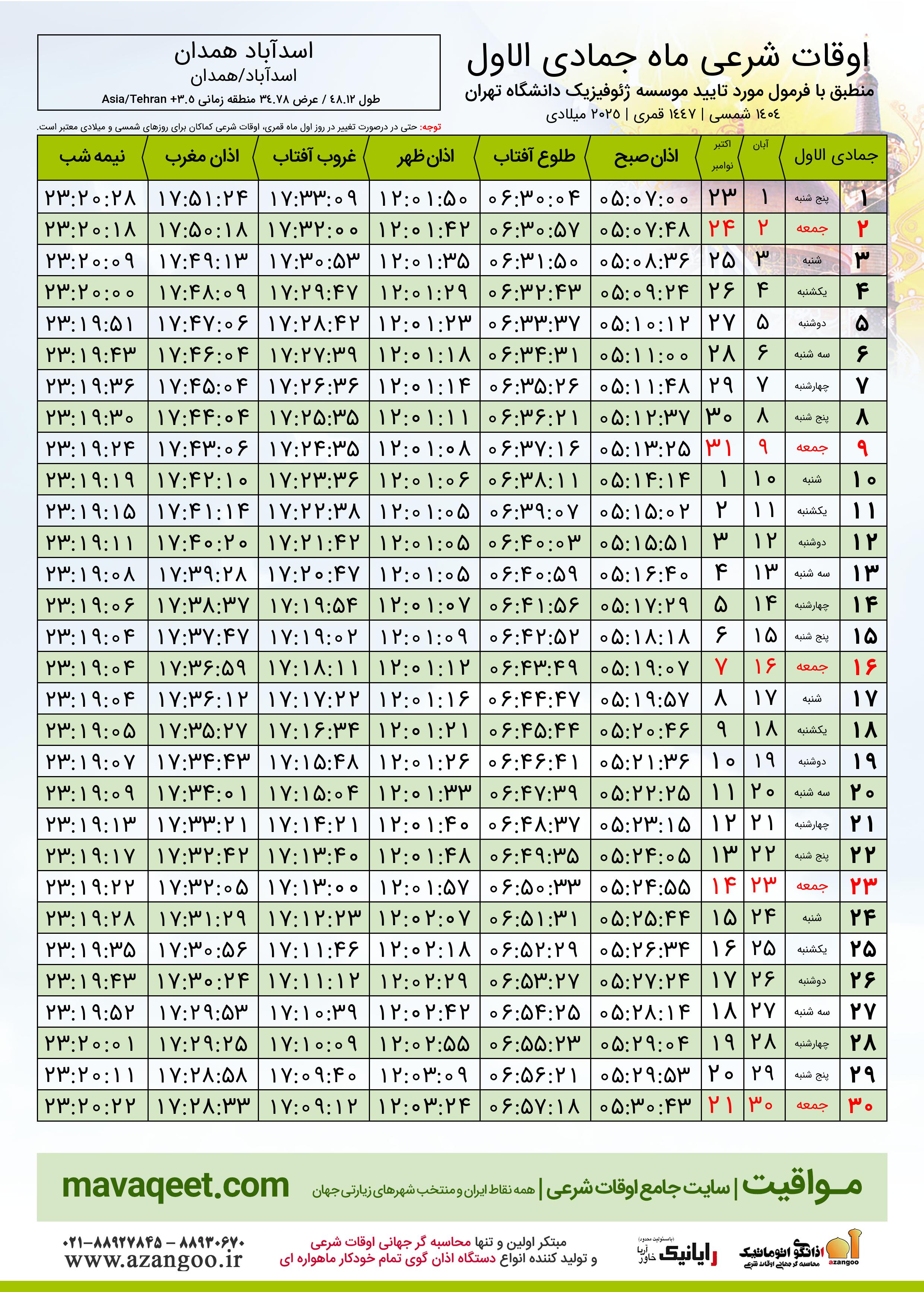 اوقات شرعی ماه جمادی الاول ١٤٤٧ هـ.ق شهر اسدآباد همدان بر