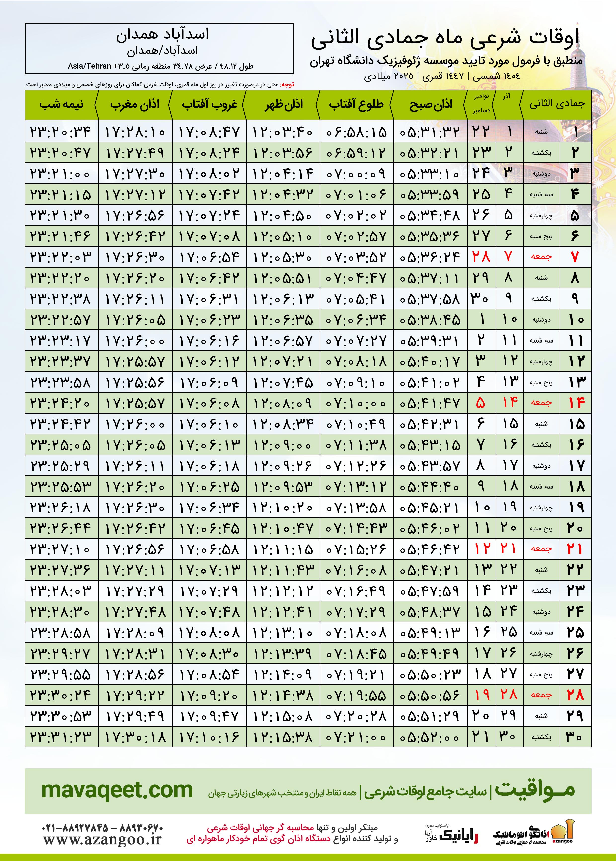 جدول اوقات شرعی جمادی الثانی ١٤٤٧ قمری شهر اسدآباد همدان