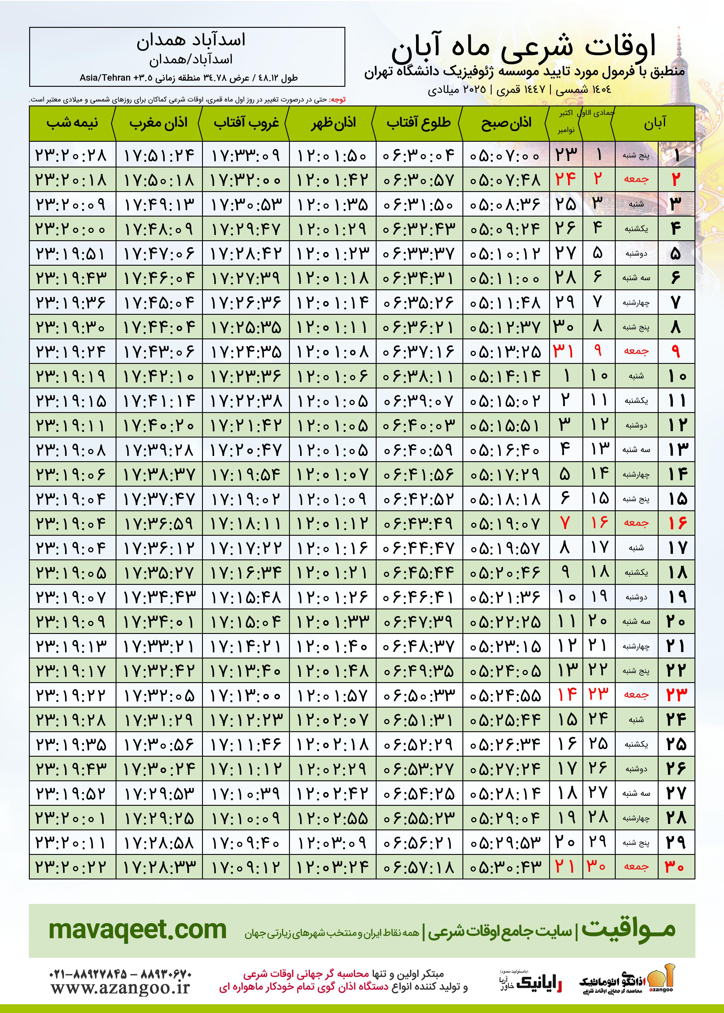 دانلود اوقات شرعی آبان ٠٤ - ١٤٠٤ شهر اسدآباد همدان