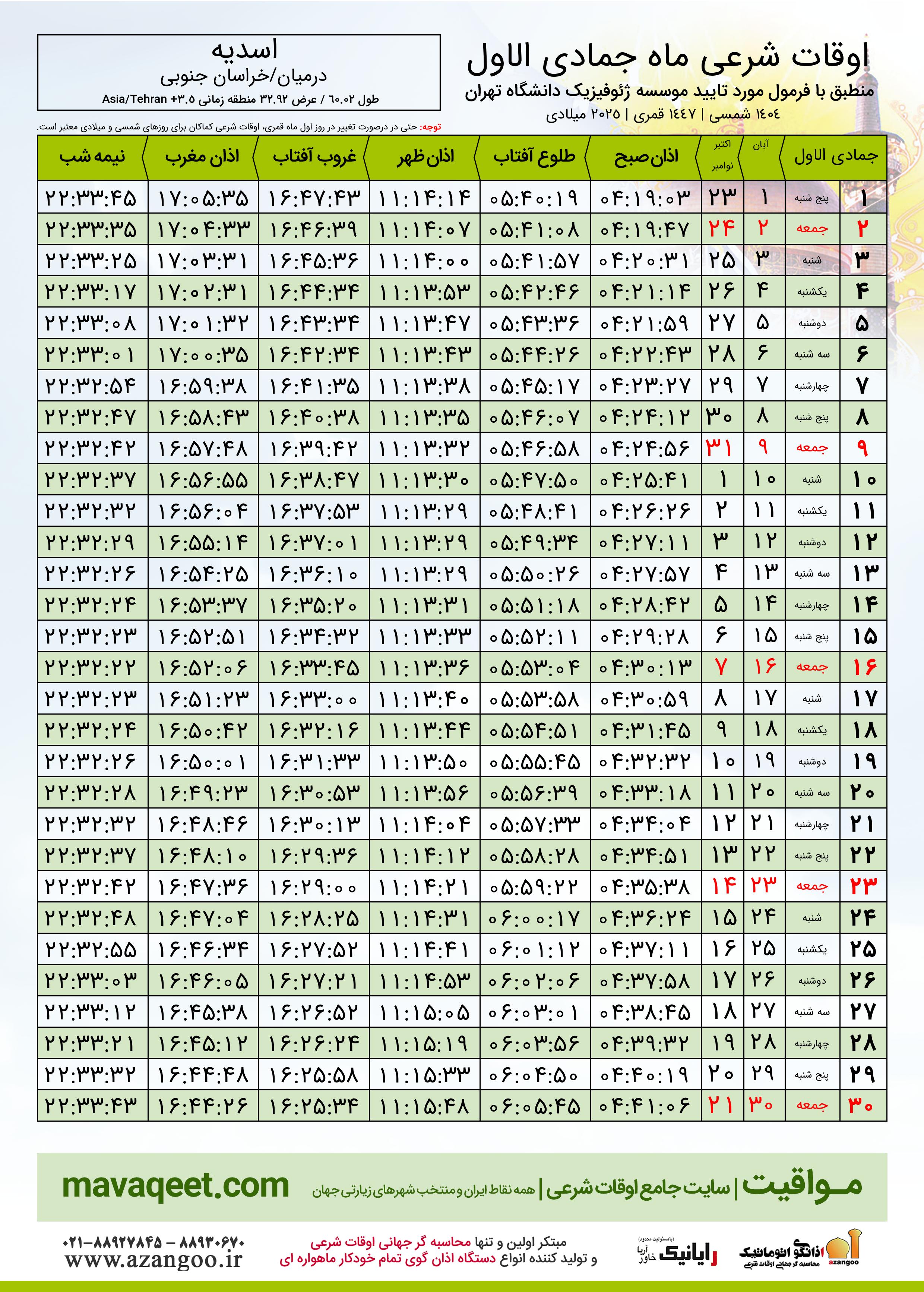 جدول اوقات شرعی جمادی الاول ١٤٤٧ قمری شهر اسدیه
