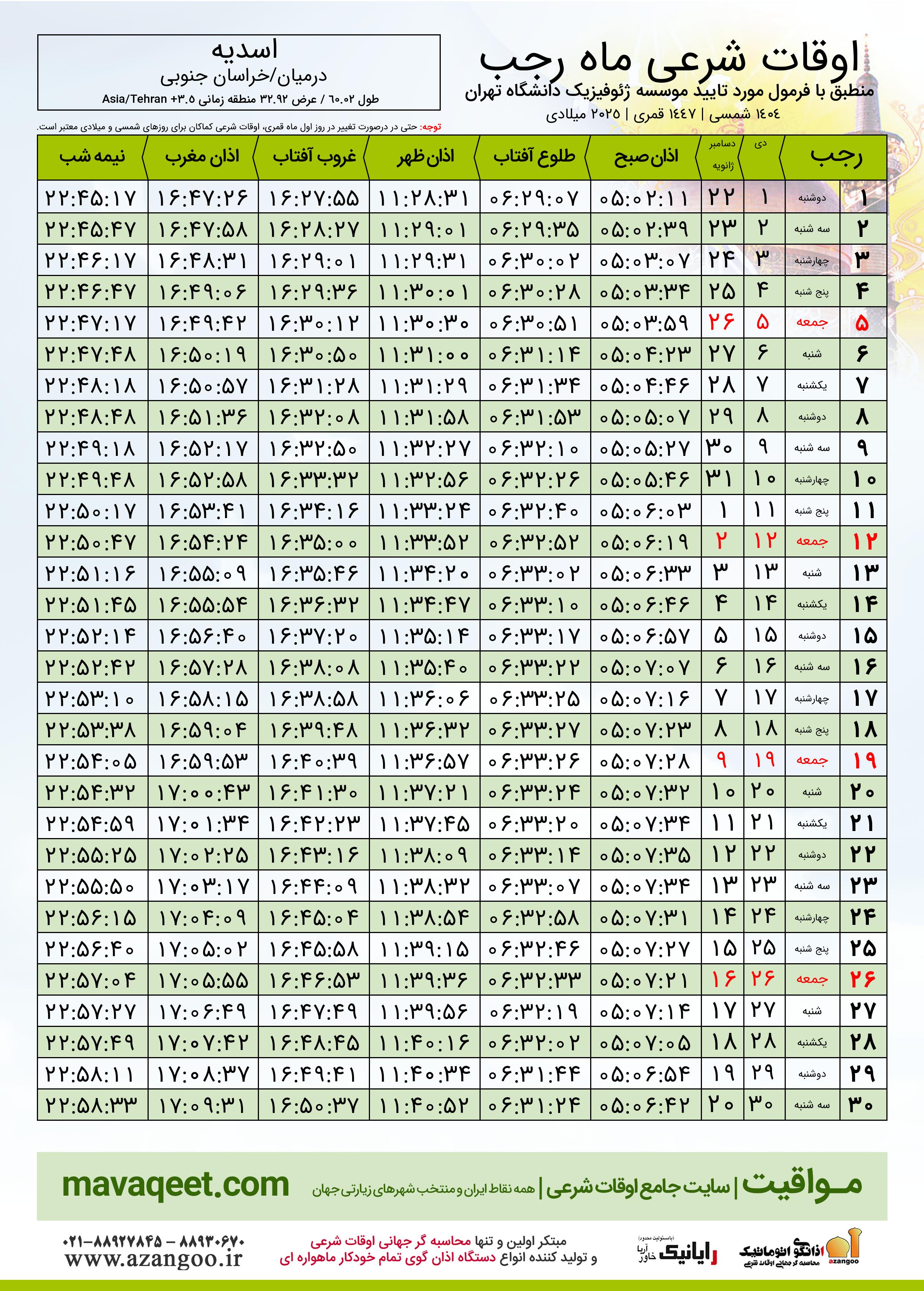 جدول اوقات شرعی رجب ١٤٤٧ قمری شهر اسدیه