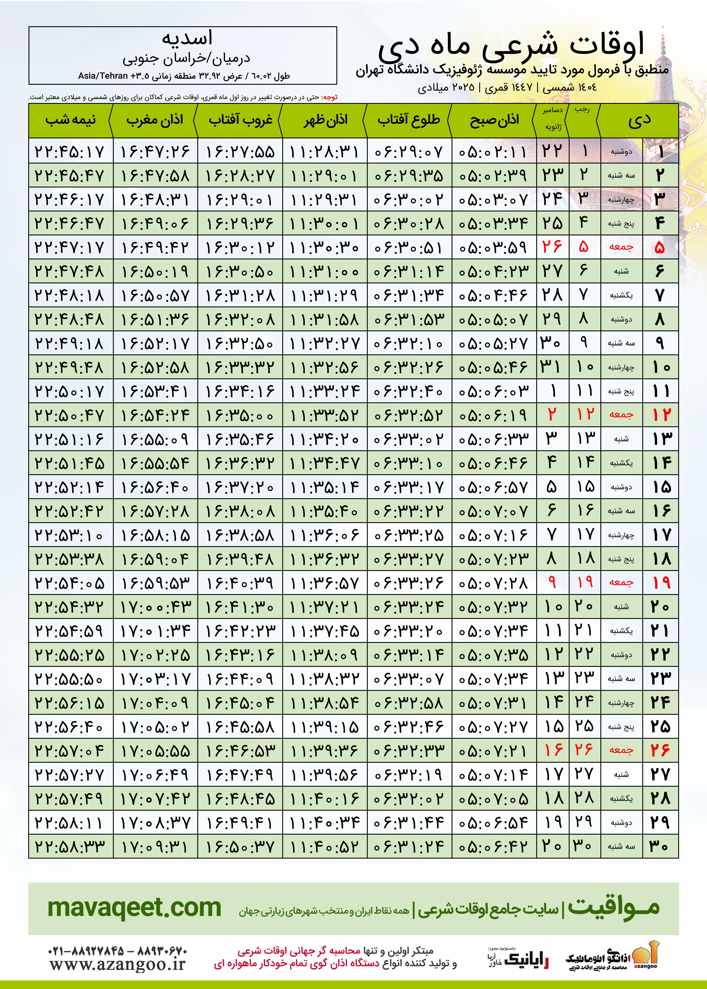 اوقات شرعی دی ١٤٠٤ شمسی شهر اسدیه
