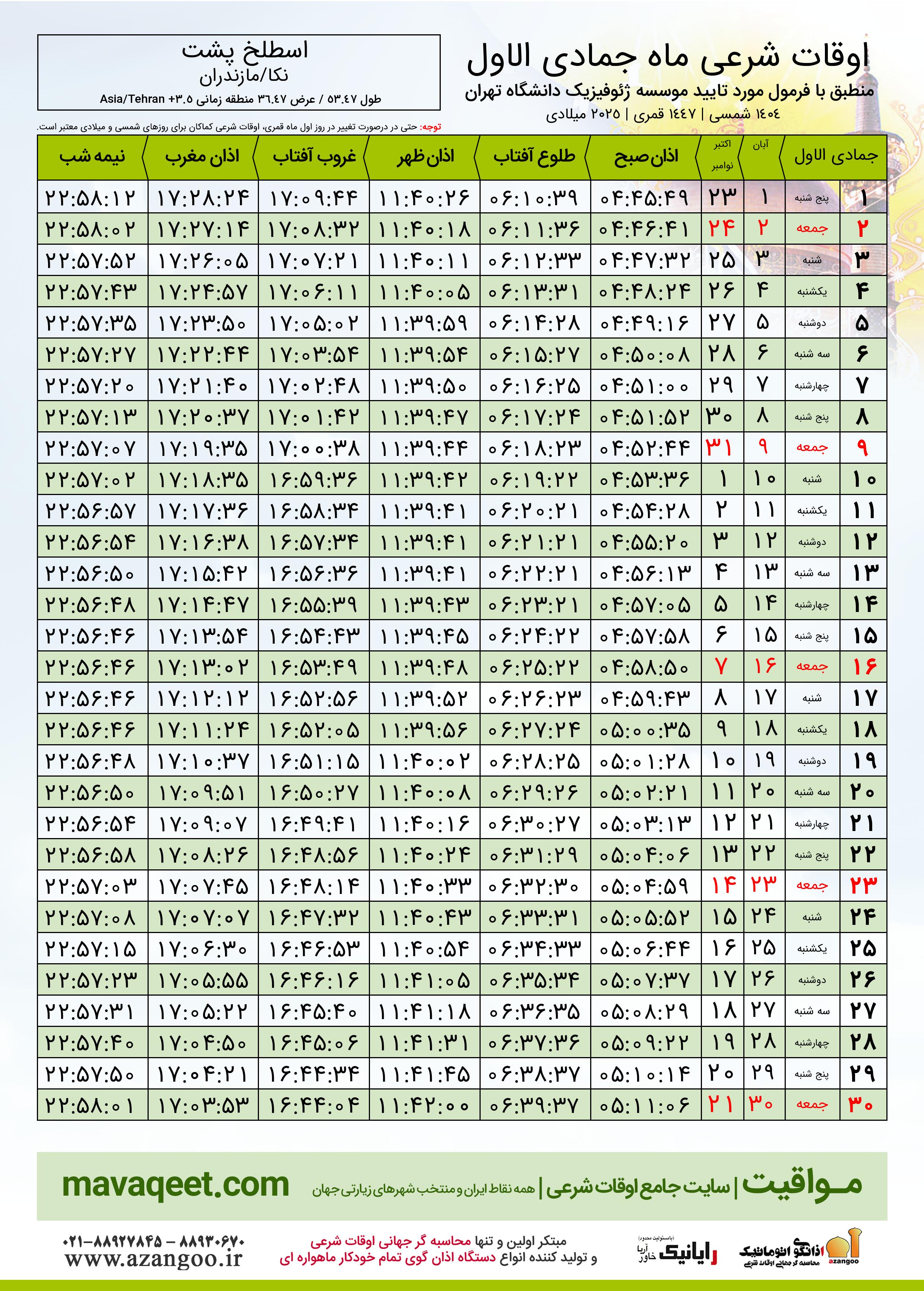 جدول اوقات شرعی جمادی الاول ١٤٤٧ قمری شهر اسطلخ پشت