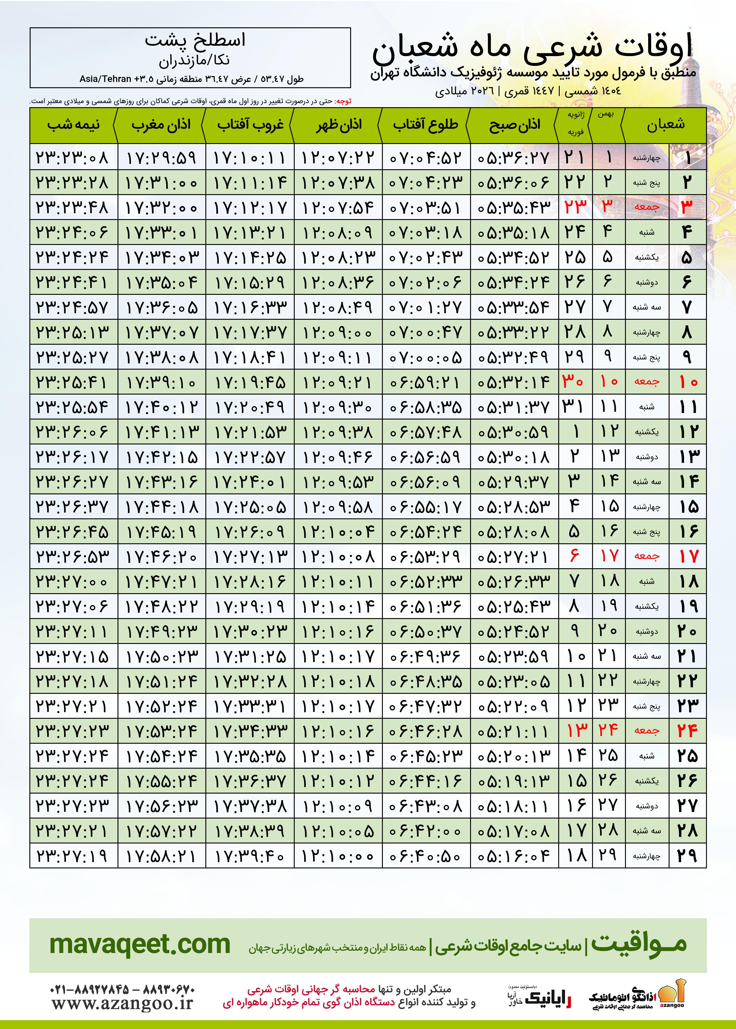 دانلود اوقات شرعی ماه شعبان ١٤٤٧ هـ.ق
