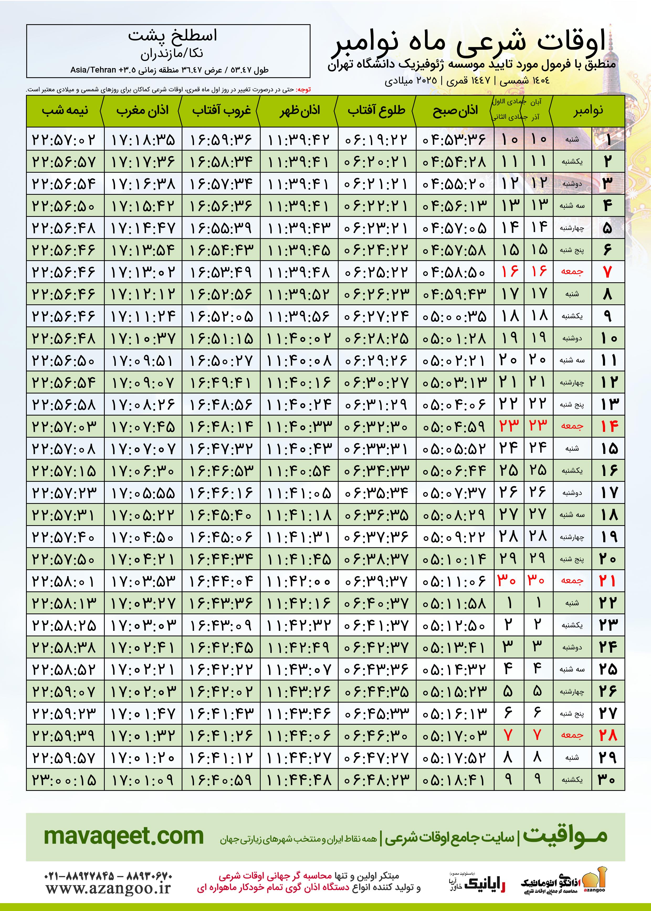 جدول اوقات شرعی نوامبر ٢٠٢٥ میلادی شهر اسطلخ پشت