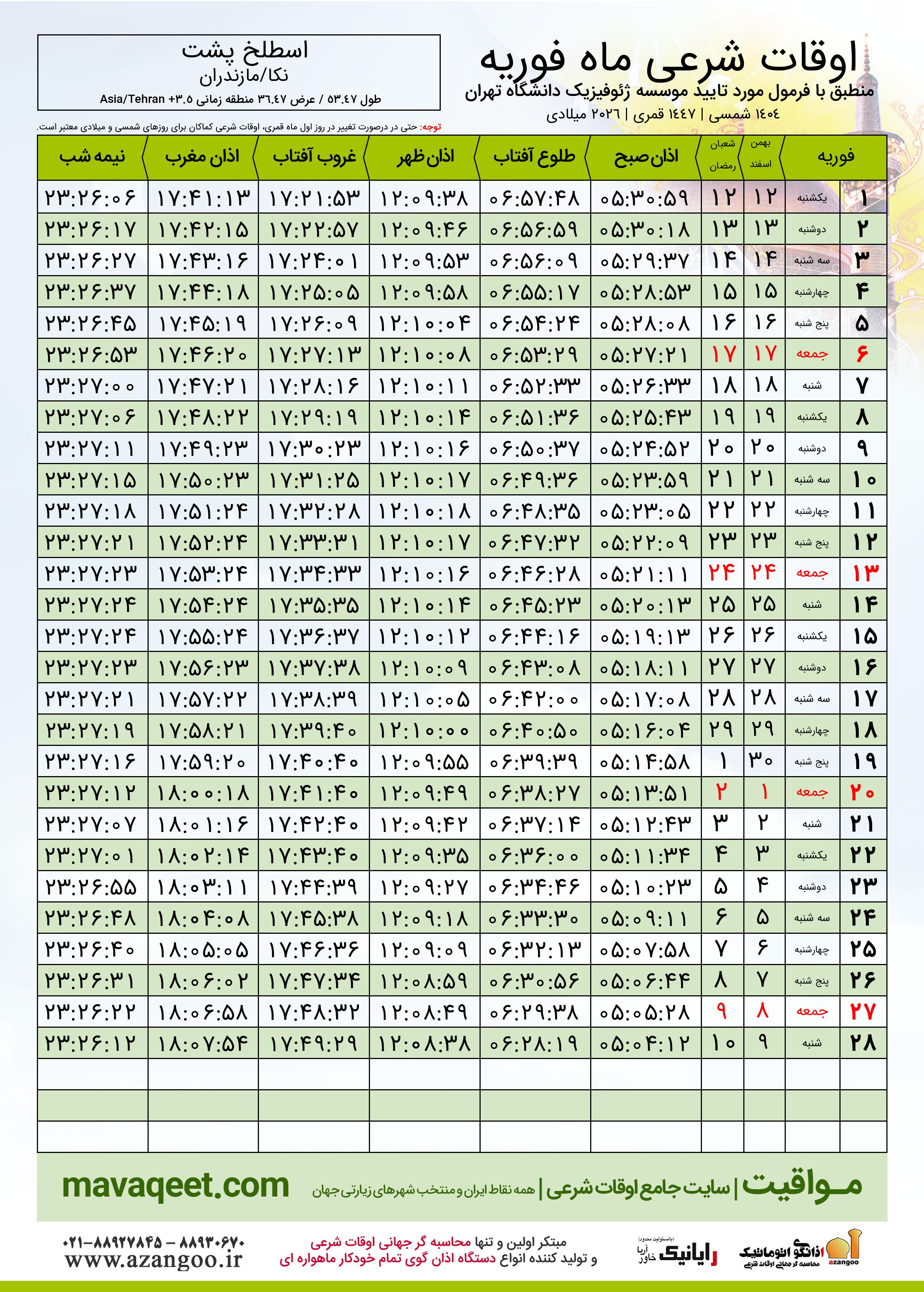 اوقات شرعی شعبان ١٤٤٧ قمری شهر اسطلخ پشت