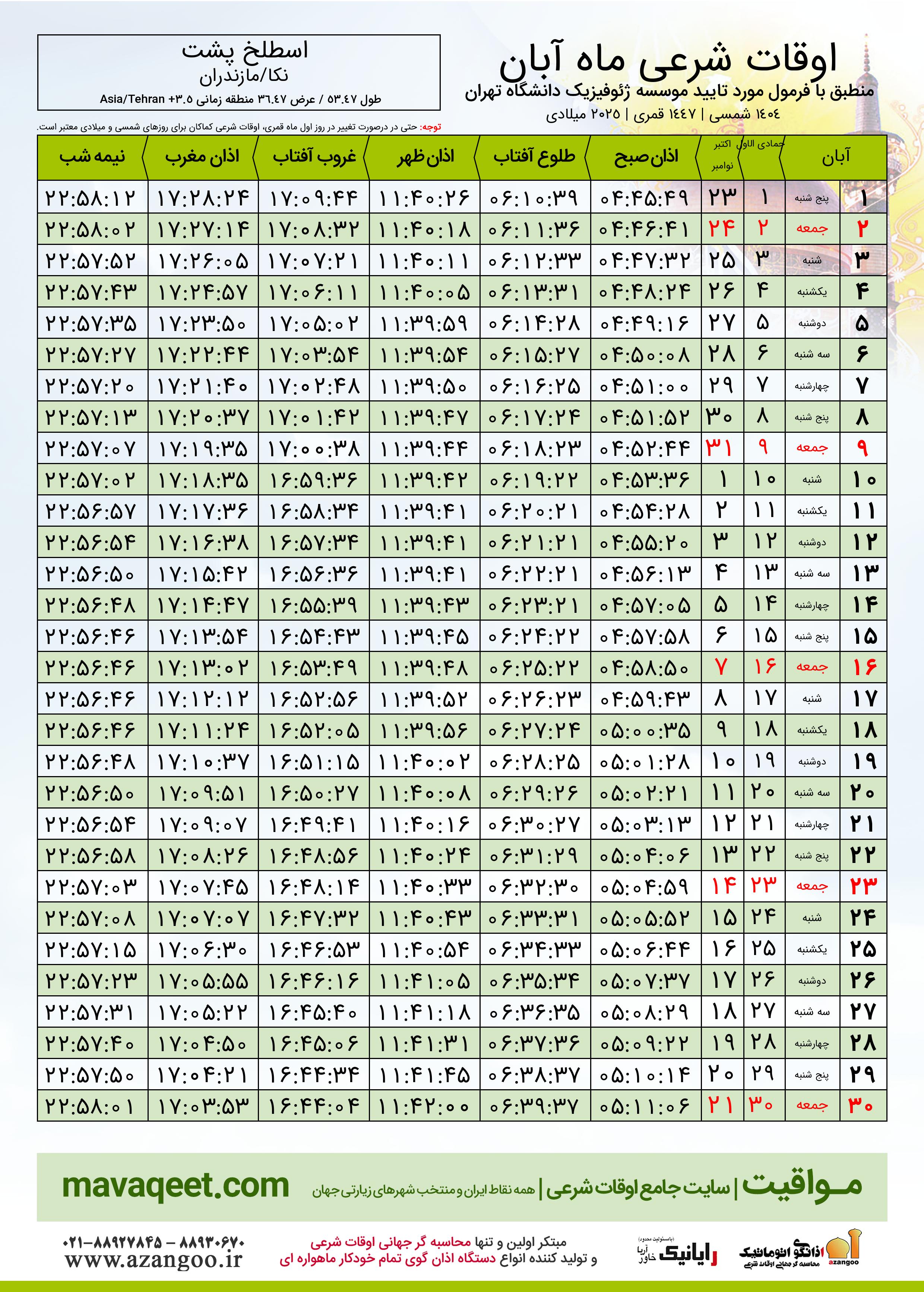 اوقات شرعی آبان ١٤٠٤ شمسی شهر اسطلخ پشت