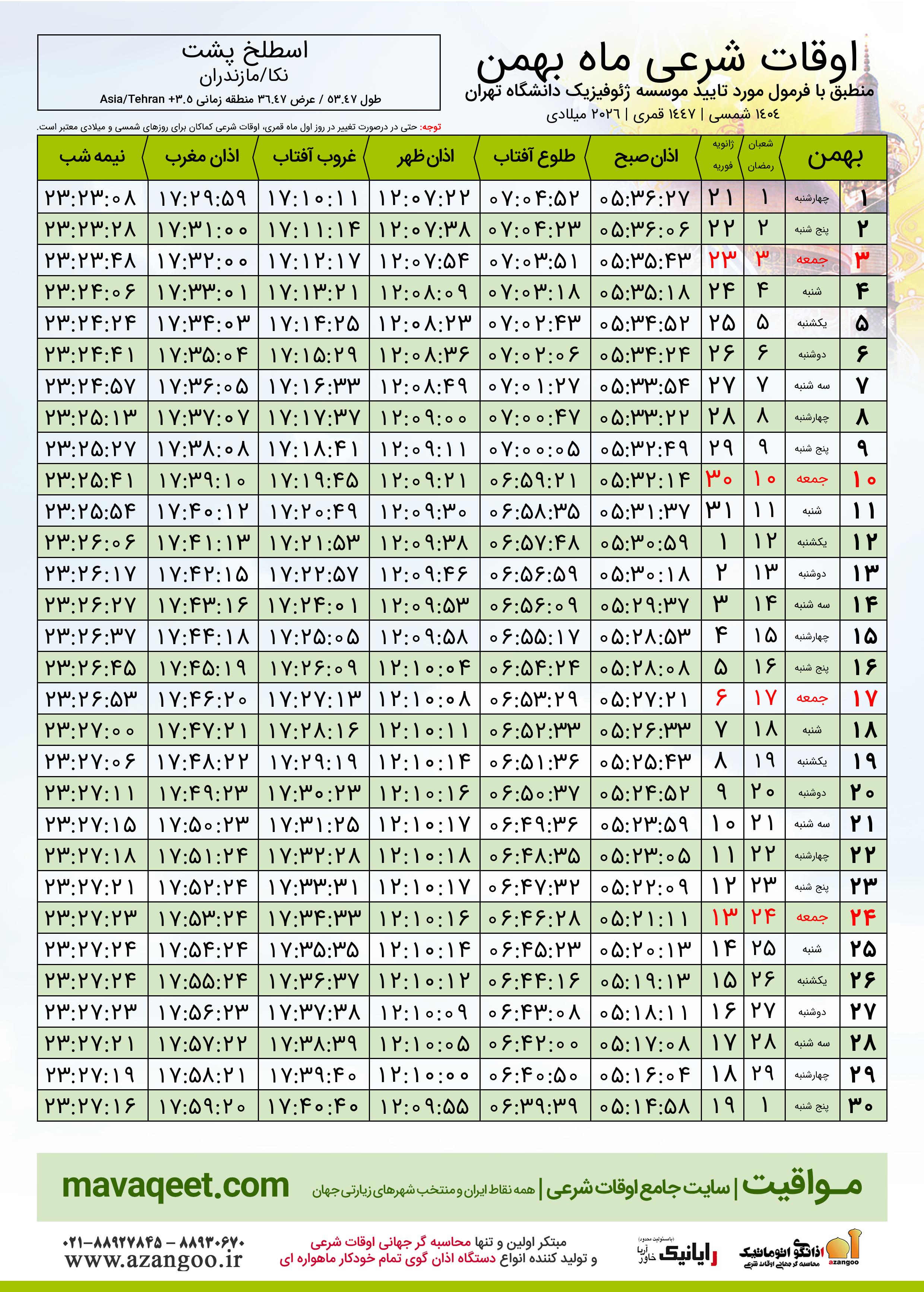 دانلود اوقات شرعی بهمن ٠٤ - ١٤٠٤ شهر اسطلخ پشت
