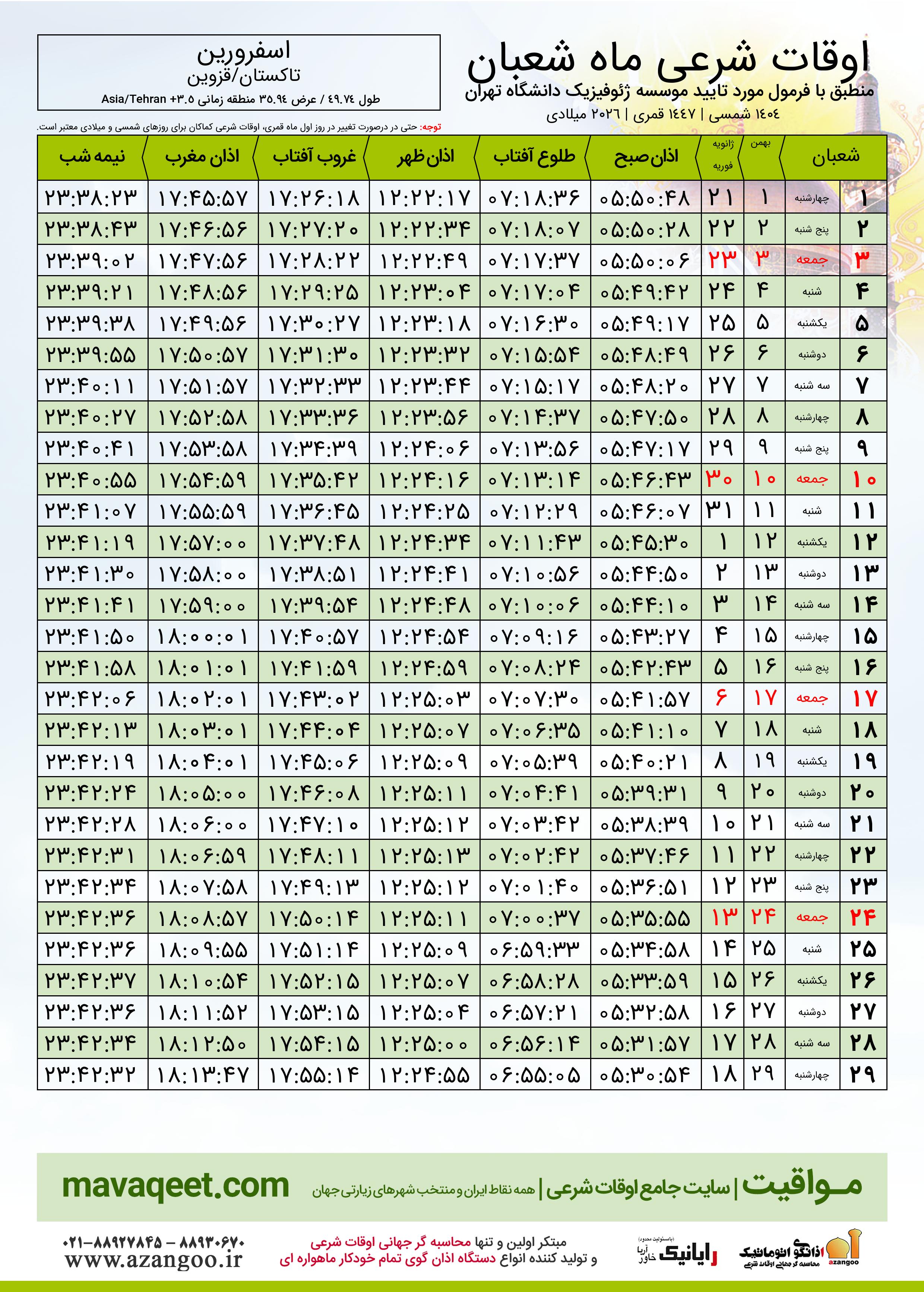 اوقات شرعی ماه شعبان ١٤٤٧ هـ.ق شهر اسفرورین بر