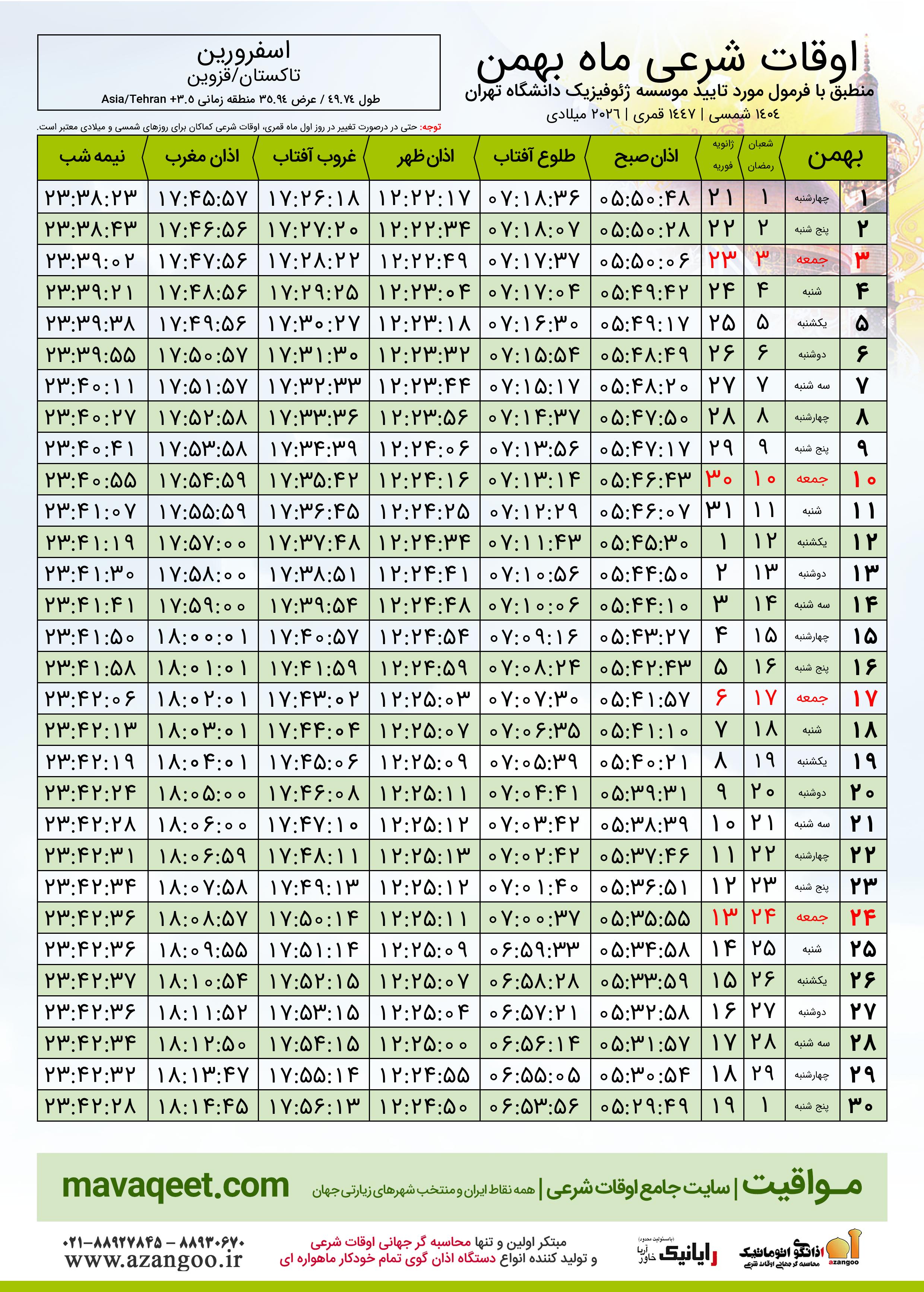 دانلود اوقات شرعی بهمن ٠٤ - ١٤٠٤ شهر اسفرورین