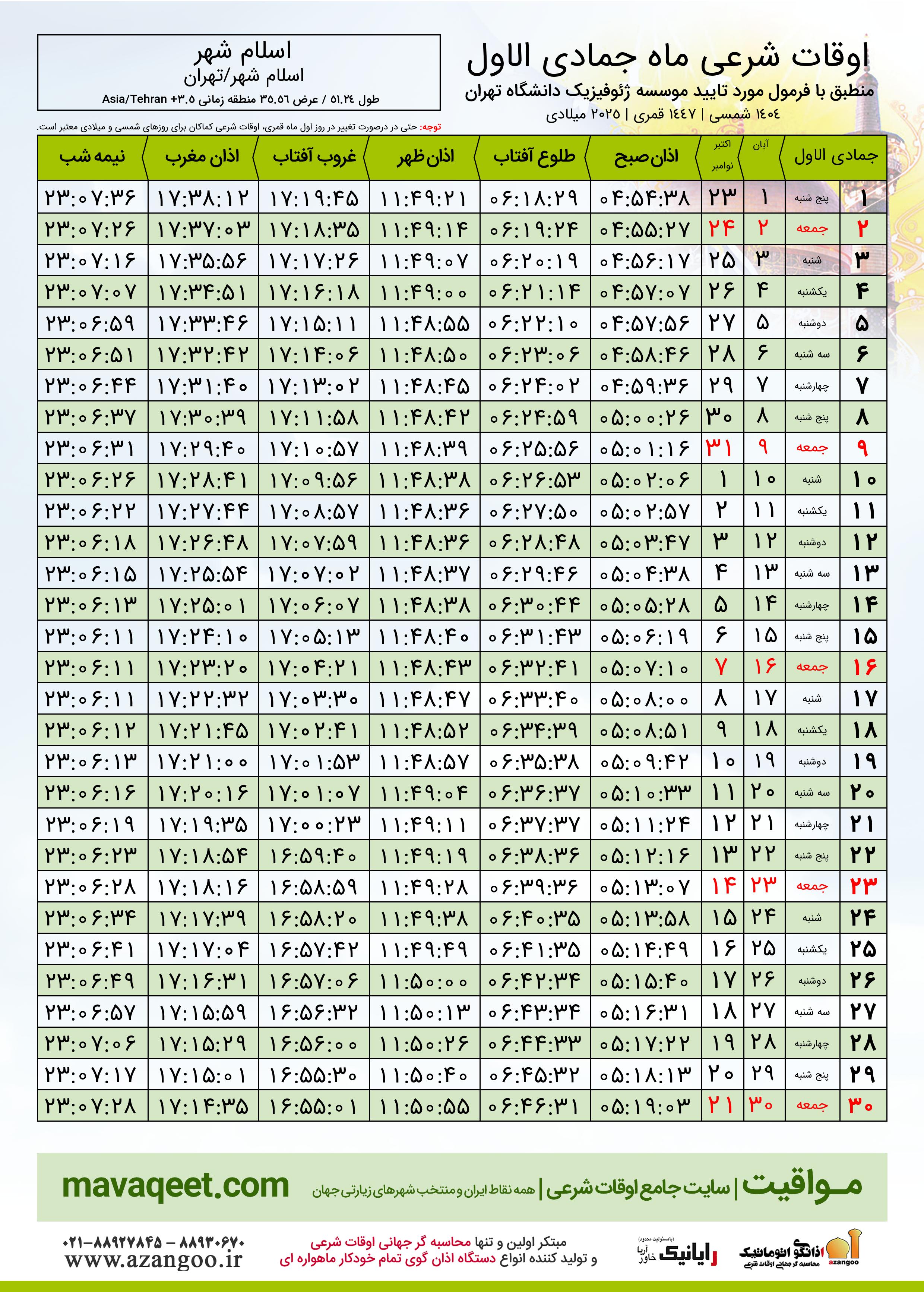 جهت نمایش تصویر جدول اوقات شرعی ماه جمادی الاول ١٤٤٧ هـ.ق شهر اسلام شهر در اندازه