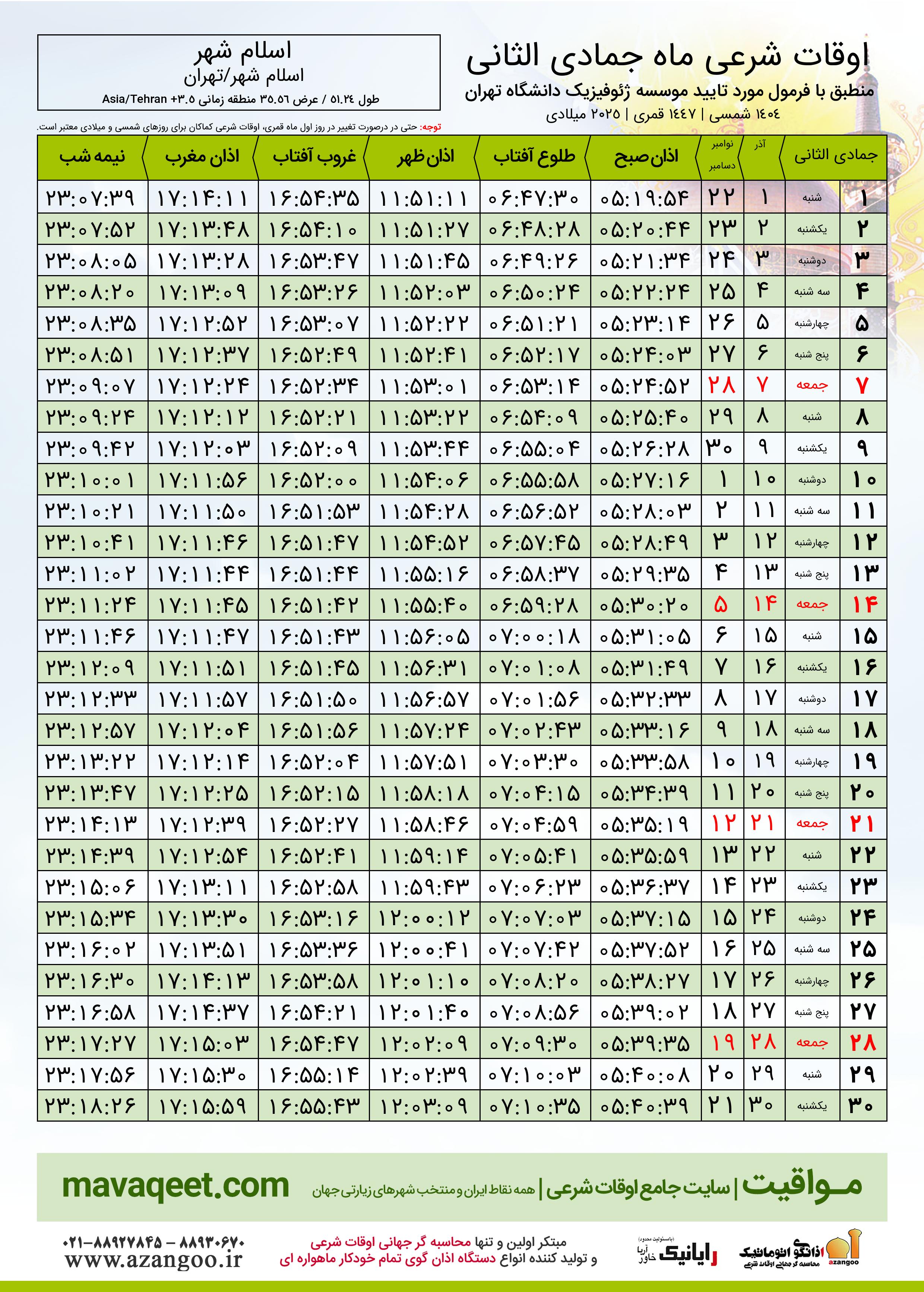 جهت نمایش تصویر جدول اوقات شرعی ماه جمادی الثانی ١٤٤٧ هـ.ق شهر اسلام شهر در اندازه