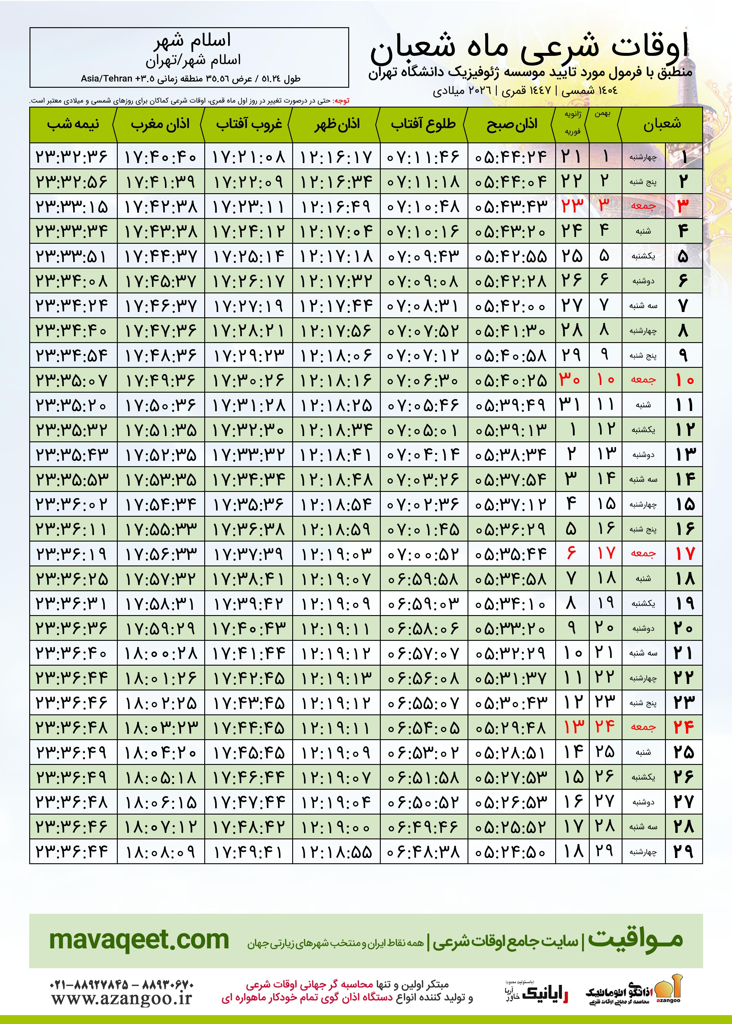 جدول اوقات شرعی شعبان ١٤٤٧ قمری شهر اسلام شهر