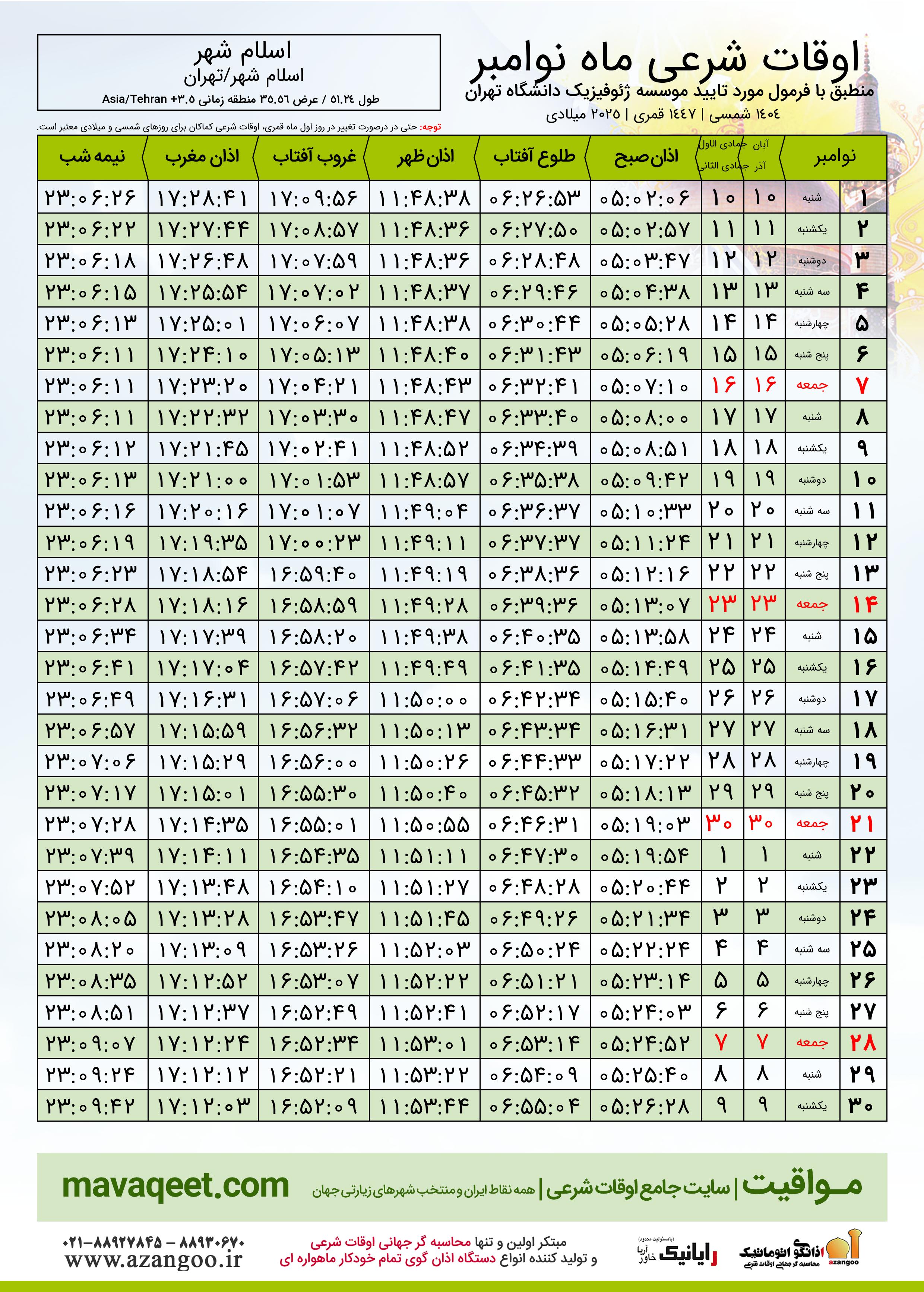 جدول اوقات شرعی نوامبر ٢٠٢٥ میلادی شهر اسلام شهر