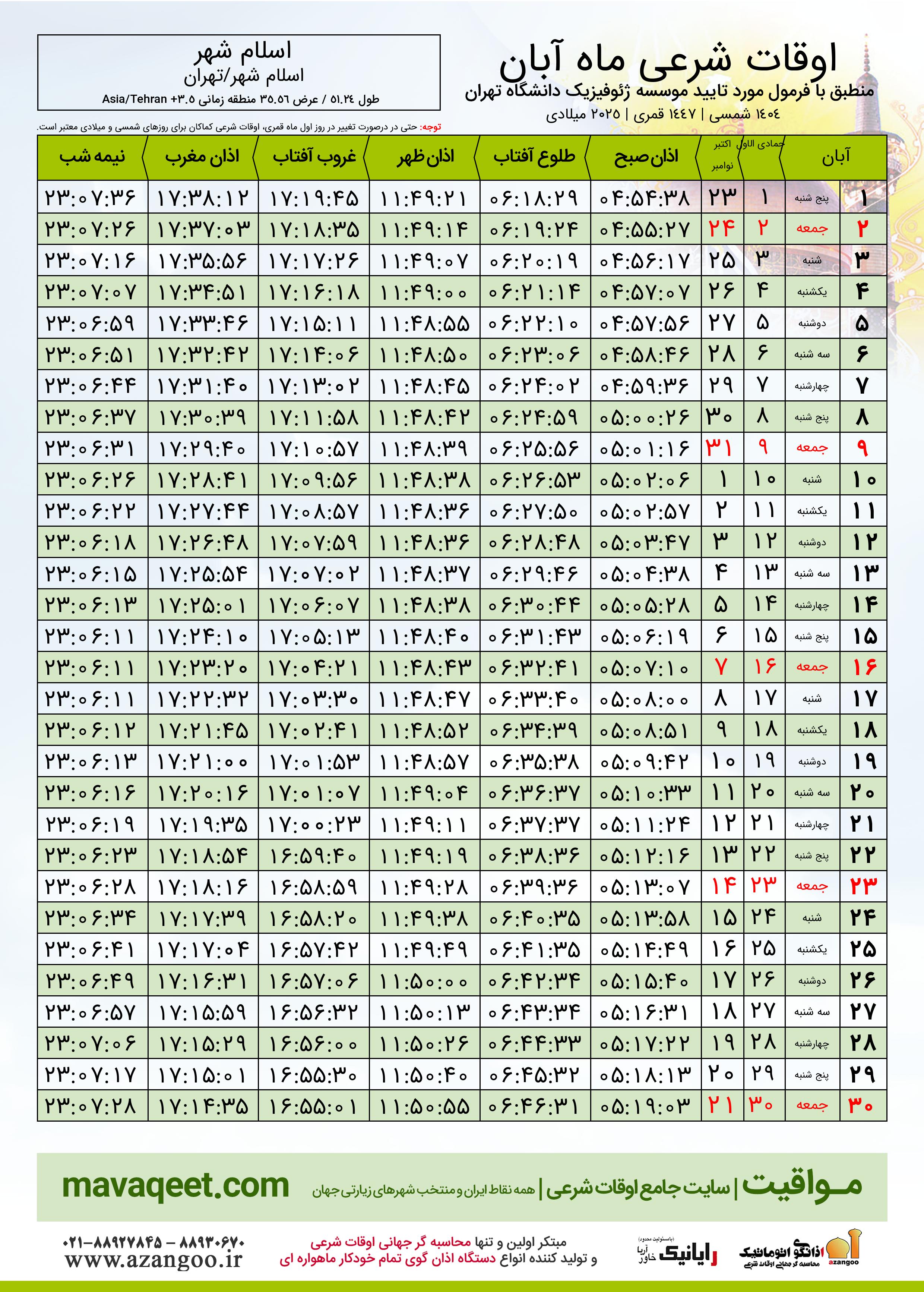 جدول اوقات شرعی آبان ١٤٠٤ شمسی شهر اسلام شهر